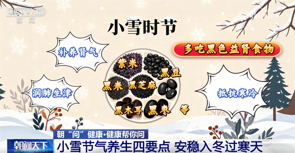 小雪时节要多吃黑色的益肾食物,如黑米、紫米、黑豆、黑芝麻、黑木耳、黑枣等,可补养肾气、抵抗寒冷、润肺生津。 多吃黑色可补肾 小雪节气 养生记牢"四个要点" 小雪节气的到来,意味着天气会越来越冷。此时养生要注意天气变化,尤其是要防寒保暖,饮食上则以御寒健脾、滋阴润肺为主。 多食苦味防"上火" 小雪时节容易出现口干舌燥、口腔溃疡、皮肤干燥的症状。"苦"为中医五味之一,具有清泄火热的作用,所以,多吃苦味食物可以有效 地"降火"。 央视网消息:11月22日,我们迎来"小雪"节气,这是农历24节气中的第20个节气。"小雪"是一个反映降水与气温的节气,也是寒潮和强冷 空气活动频数较高的节气。 多食粥汤养脾胃 冬天多食热粥有益健康,如小麦粥、萝卜粥、大枣粥等,能润泽肠胃,补养身体。冬季喝汤能驱寒、预防感冒。 寒冷刺激会让交感神经异常兴奋,进而增强心脏收缩力、引发血压波动,增加急性并发症的风险,容易导致心绞痛、心梗、中风等疾病发 生。因此,高血压患者必须坚持规律服药,并定时监测血压变化。老年人外出则建议随身携带硝酸甘油、速效救心丸等急救药物。 多饮热水促代谢 水是维持人体生命活动和健康的关键元素,每天清晨空腹喝一杯温开水,能 ...