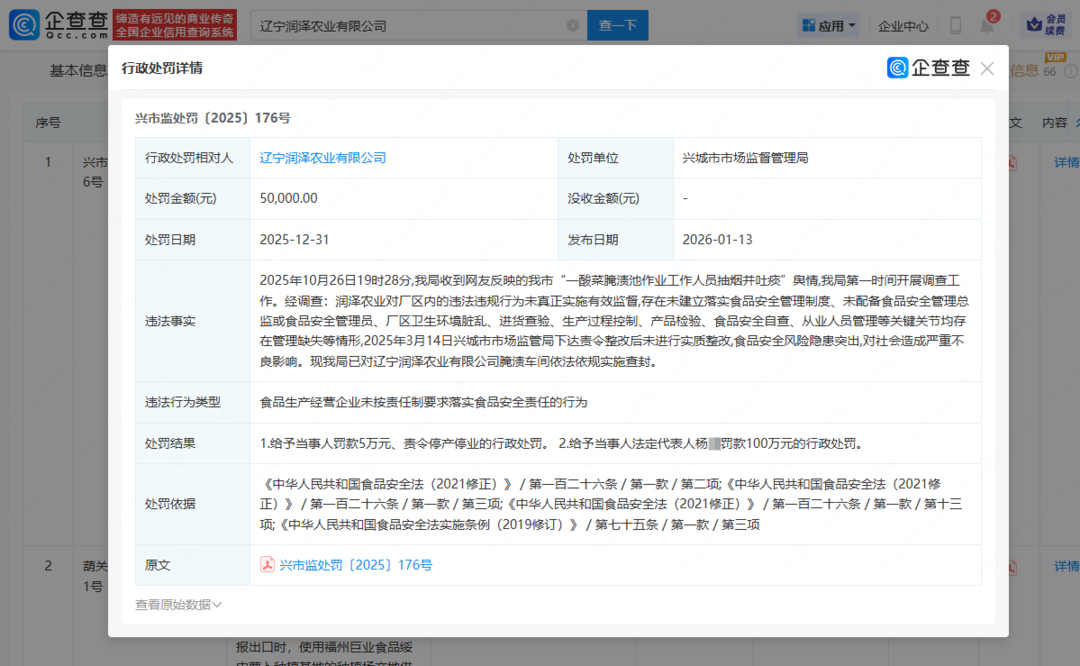 事件概述 - 辽宁润泽农业有限公司因员工在酸菜池中抽烟吐痰的严重食品安全事件受到行政处罚[1] - 公司被处以罚款5万元并被责令停产停业 法定代表人杨某被处以个人罚款100万元[1][2] 行政处罚详情 - 处罚决定书号为兴市监处罚〔2025〕176号 由兴城市市场监督管理局作出[2] - 处罚日期为2025年12月31日 发布日期为2026年1月13日[2] - 处罚依据为《中华人民共和国食品安全法(2021修正)》第一百二十六条及相关条款[2] 违法事实与调查过程 - 2025年10月26日 兴城市市监局收到关于“酸菜腌渍池作业工作人员抽烟并吐痰”的网友舆情后立即展开调查[2][3] - 调查发现公司对厂区违法违规行为未实施有效监督 未建立落实食品安全管理制度 未配备食品安全管理总监或管理员[2][3] - 厂区卫生环境脏乱 在进货查验、生产过程控制、产品检验、食品安全自查及从业人员管理等关键环节均存在管理缺失[2][3] - 公司在2025年3月14日收到市监局下达的责令整改后 未进行实质整改 导致食品安全风险隐患突出[2][3] - 市监局已对公司的腌渍车间依法实施查封[2][3] 事件背景与官方处置 - 事件源于2025年10月一段引发关注的网络视频 视频显示一名男子在酸菜池中边工作边抽烟并随口吐痰[4] - 2025年10月27日 兴城市市场监督管理局发布通报 确认该批次酸菜已被全部扣押 未流入市场 并将按规定销毁[4] - 官方通报表示将对违法企业和相关责任人依法严惩、绝不姑息[4]