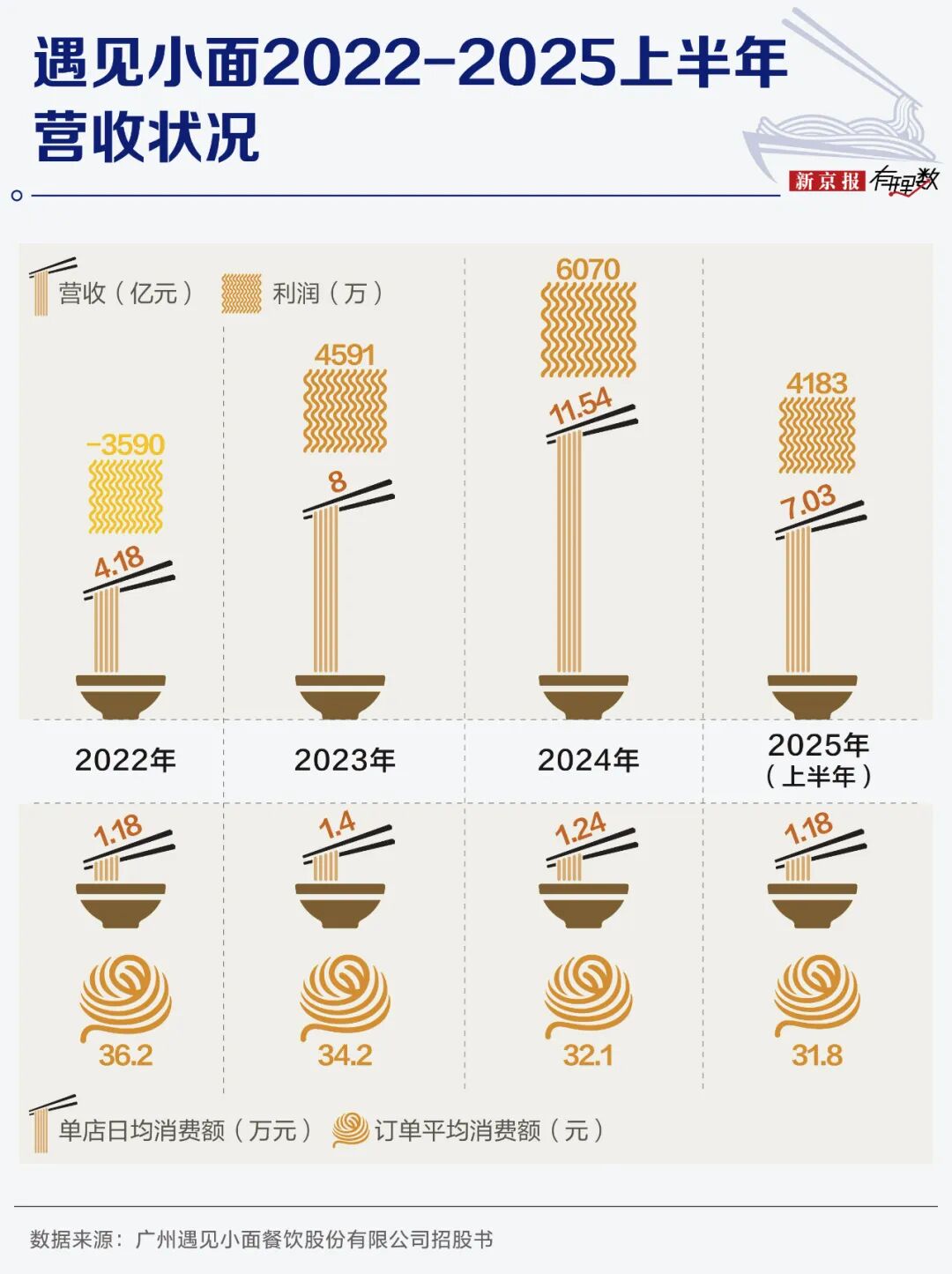 10月15日,广州遇见小面餐饮股份有限公司(以下简称遇见小面)在港交所递交招股书,拟香港主板IPO上市。这是继今年4月15日首次递表失效之后, 遇见小面再度冲刺港交所。 一石激起千层浪。这两年来,中式面馆亏损、降价、裁员、闭店等新闻层出不穷,遇见小面却在此时以高调之势将中式面馆重新拉回大众视野。 如果IPO顺利,遇见小面有望成为"中式面馆第一股"。 但上市之路也并非通畅,从业绩来看,虽然遇见小面营收整体增加,但2024年增速明显放缓,客单价更是四连降。而且,网络上也有大量关于"新中式面 馆"价格贵、食品安全的质疑声,怎样将面条更好地卖下去,在消费降级的当下,是新中式面馆普遍面临的问题。 遇见小面靠啥上市? 从遇见小面的招股书看,2022—2024年,遇见小面营收从4.18亿元增至11.54亿元,但2024年的增速明显放缓。好在2025年上半年,营收和盈利都显著提 升,分别同比增长33.8%、131.56%。 增长的背后,客单价却在不断下跌。从直营店的数据看,遇见小面的单店日均销售额从2023年的1.4万元降至2024年的1.24万元,同比下滑11.43%;客单 价连续三年下降,从2022年的36.2元降至20 ...