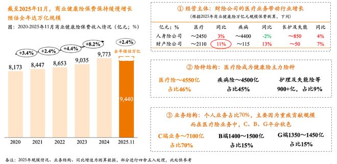 2025年商业健康险保费规模与增速 - 2025年商业健康险保费收入为9973亿元,同比增长2.04%,离万亿元大关仅差27亿元 [2][3] - 全年保费增速2.04%创下近五年来的新低,近五年增速区间在2.04%至8.18%之间,较2013-2019年超30%的年复合增速显著放缓 [8][10] - 12月单月健康险保费同比负增长3.6%,逆转了11月同比正增长3.3%的趋势,导致全年未能突破万亿 [3] 人身险与财产险公司业务分化 - 人身险公司健康险业务拖累整体增长,其2025年全年健康险保费同比微降0.41%至7699亿元,12月单月保费同比下降5.9% [3] - 财产险公司健康险业务增长强劲,2025年全年保费同比增长11.31%,12月单月保费同比增长8.8% [3] - 分化原因在于人身险公司主力产品长期重疾险增长乏力,而财产险公司凭借车险渠道、政府业务及短期“百万重疾险”等实现快速上量 [4][5] 市场增长乏力与结构性调整阵痛 - 传统主力产品增长乏力,重疾险新单匮乏,长期医疗险面临预定利率下调带来的涨价压力 [4][11] - 医疗险陷入同质化及供需错配困境,当前供给集中于健康人群的医保目录内保障,对非标体/带病体人群的系统性保障及医保目录外(如高端医疗、创新药械)保障明显不足 [12] - 消费者对术后康复、慢病管理、就医体验等“保健康、保生活”的长尾需求日益增长,与供给侧同质化形成反差 [12] 政策支持与行业未来发展方向 - 2025年是商业健康险政策大年,《关于推动健康保险高质量发展的指导意见》发布,被视为市场“新五年规划”,提出保险与医养康养结合、团险个险协同及创新产品等方向 [13] - 商保创新药目录发布、长护险从试点走向全面建立,为行业参与创新药支付和商业护理险发展明确了空间 [13] - 多个行业组织发声护航,将开展商业医疗保险净成本表编制、强化基础设施、推动“医、保、药”协同发展 [14] 行业未来增长预期与关键方向 - 业内预计2026年商业健康险保费规模将肯定突破万亿元大关 [13] - 医疗险被视为确定性最强的增长极,消费者对优质医疗服务的追求将提升中高端医疗险需求,AI赋能的“健康支付+健康服务”模式及闭环生态构建将成为竞争核心 [14] - 未来三大关键方向:产品创新聚焦带病体、老年群体及长期护理险;服务模式向“全周期健康管理”转型;政策驱动深化“医、保、药”生态联动 [14]