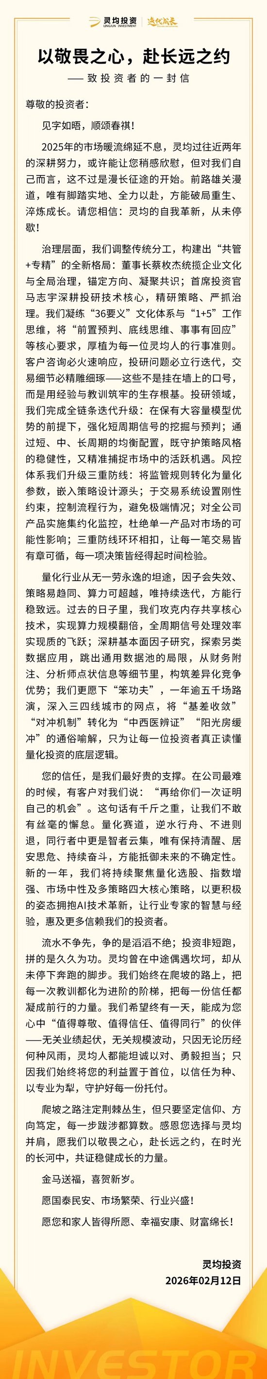 文章核心观点 - 公司发布2026年新春献词,总结过往近两年的深耕努力,并强调在量化投资领域通过持续的自我革新、技术迭代、风控升级和客户沟通,旨在行稳致远,构建差异化竞争优势,以赢得投资者的长期信任 [1][4][6][9] 公司治理与组织架构 - 调整传统分工,构建“共管+专精”新格局:董事长统揽企业文化与全局治理,首席投资官深耕投研技术核心 [6] - 凝练“36要义”文化体系与“1+5”工作思维,将“前置预判、底线思维、事事有回应”等核心要求厚植为行事准则 [6] - 强调客户咨询火速响应、投研问题立行迭代、交易细节精雕细琢,这些是由经验与教训筑牢的生存根基 [6] 投研体系与技术迭代 - 完成投研全链条迭代升级,在保有大容量模型优势的前提下,强化短周期信号的挖掘与预判 [6] - 通过短、中、长周期的均衡配置,守护策略风格稳健性并精准捕捉市场活跃机遇 [6] - 攻克内存共享核心技术,实现算力规模翻倍,全周期信号处理效率实现质的飞跃 [3][8] - 深耕基本面因子研究,探索另类数据应用,跳出通用数据池局限,从财务附注、分析师点状信息等细节构筑差异化竞争优势 [3][8] - 量化行业无坦途,因子会失效、策略易趋同、算力可超越,唯持续迭代方能行稳致远 [3][7][8] 风险控制体系 - 升级三重风控防线:将监管规则转化为量化参数嵌入策略设计源头 [3][6] - 在交易系统设置刚性约束,控制流程行为,避免极端情况 [3][6] - 对全公司产品实施集约化监控,杜绝单一产品对市场的可能性影响 [3][6] - 三重防线环环相扣,确保每笔交易有章可循,每项决策经得起时间检验 [3][6] 客户沟通与市场拓展 - 公司重视投资者教育,一年举办逾五千场路演,深入三四线城市网点 [3][8] - 将“基差收敛”、“对冲机制”等专业术语转化为“中西医辨证”、“阳光房缓冲”等通俗比喻,旨在让投资者真正读懂量化投资底层逻辑 [3][8] - 客户信任被视为最宝贵的支撑,公司以居安思危、持续奋斗的态度应对量化赛道逆水行舟的竞争 [4][8] 未来战略与核心策略 - 新的一年将持续聚焦四大核心策略:量化选股、指数增强、市场中性及多策略 [4][8] - 将以更积极姿态拥抱AI技术革新,让行业专家的智慧与经验惠及更多投资者 [4][8] - 强调投资是长期事业,公司虽曾偶遇坎坷但从未停下脚步,致力于成为投资者心中值得尊敬、信任与同行的伙伴 [4][9]