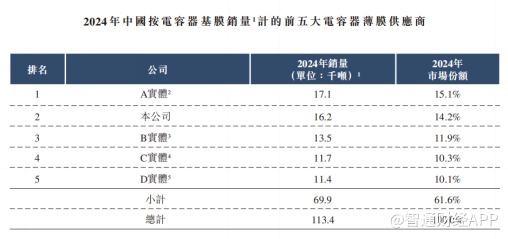 公司产品与市场地位 - 公司主要产品为电容器基膜及金属化膜,是薄膜电容器的关键组成部分,以出色的耐电压性、高频稳定性和长使用寿命著称 [4] - 产品终端应用广泛,包括新能源汽车、新能源电力系统、工业设备及家用电器 [4] - 按电容器基膜收入计,公司于2024年在中国市场份额为10.9% [4] - 公司是唯一一家拥有电容器基膜生产线自主设计及开发能力的公司,截至2025年8月21日,公司现有的五条生产线皆由公司自主设计、开发及组装 [4] 行业市场规模与增长 - 以销量计,中国电容器基膜市场规模从2019年的46,200吨增长至2024年的113,400吨,期间年复合增长率为19.7% [4] - 预计中国电容器基膜市场规模到2029年将达到224,100吨,2025年至2029年的年复合增长率为14.1% [4] - 电容器基膜的市场规模被广泛用于代表电容器薄膜产品的市场规模,因为电容器薄膜制造商的大部分产品以电容器基膜交付 [4] 公司核心技术优势 - 公司自主设计和开发的电容器基膜生产线交付期约八个月,显著低于行业内平均三至五年的进口生产线交付期 [5] - 公司新建的电容器基膜生产线投资成本预计约为人民币1.2亿元,远低于中国的行业平均水平 [5] - 通过灵活调整生产线参数,公司可提供多种规格的电容器薄膜产品,产品厚度范围覆盖2.7微米至13.8微米,覆盖多个终端应用场景 [5] 公司财务表现 - 2022年度、2023年度、2024年度及2025年前五个月,公司收入分别约为人民币3.27亿元、3.30亿元、4.22亿元、1.57亿元 [5][7] - 同期,公司年内利润及全面收益总额分别约为人民币1.02亿元、6982.6万元、8641.8万元、3135.9万元 [5][7] - 2022年至2024年,公司毛利率分别为44.9%、31.2%、29.7%,2025年前五个月毛利率为35.5% [7] - 公司研发开支占收入比例从2022年的3.4%提升至2025年前五个月的4.6% [7]