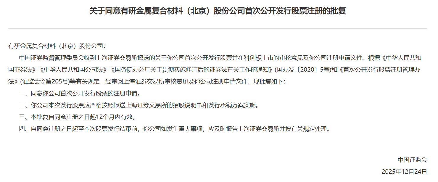 公司上市与募资计划 - 中国证监会于12月25日同意有研金属复合材料(北京)股份公司首次公开发行股票注册 [1] - 公司计划在上海证券交易所科创板上市 [1] - 本次发行的保荐机构为中信证券 [1] - 公司拟通过首次公开发行募集资金9亿元人民币 [1] 公司业务与产品概况 - 公司是一家主要从事金属复合材料及制品、特种有色金属合金制品研发、生产和销售的高新技术企业 [3] - 公司业务主要分为金属复合材料及制品和特种有色金属合金制品两大板块 [3] - 主要产品包括金属基复合材料及制品、双金属复合材料及制品、特种铝合金制品和特种铜合金制品等 [3] - 目前公司的金属基复合材料产品主要为铝基复合材料 [3] 产品应用与市场地位 - 公司产品广泛应用于航空航天、军工电子、智能终端、家用电器等领域 [3] - 公司主要产品中的航空锻件已批量应用于直升机和固定翼飞机 [3] - 该航空锻件产品实现了我国航空领域关键零部件的首次应用和进口替代 [3] - 公司已成为国内该类航空锻件产品的唯一供应商 [3]