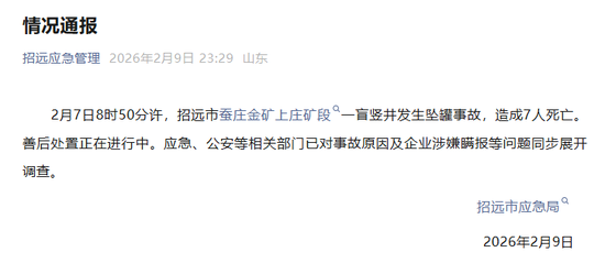 事故概述 - 2026年2月7日8时50分许,招远市蚕庄金矿上庄矿段一盲竖井发生坠罐事故,造成7人死亡 [1][6] - 善后处置正在进行中,应急、公安等相关部门已对事故原因及企业涉嫌瞒报等问题同步展开调查 [1][6] - 截至2月10日上午,事故及涉嫌瞒报等情况仍在调查中,尚无进一步信息披露 [3][7] 涉事公司背景 - 发生事故的蚕庄金矿隶属于招金矿业股份有限公司 [3][7] - 该公司成立于2009年,是一家以从事有色金属矿采选业为主的企业 [3][7] 公司历史处罚记录 - 2025年7月17日,蚕庄金矿因应急救援库内止血带、三角巾、挎包数量少于应急预案规定数量,被处以2.5万元罚款 [4][8] - 2025年10月31日,蚕庄金矿因上庄矿段-460m中段一处独头倒车巷未安装局部通风机通风,以及-860m中段中央水泵房配电所变压器冗余不足(单台容量630KVA,一台停运时另一台不能承担全部负荷),被处以罚款3万元 [4][8]