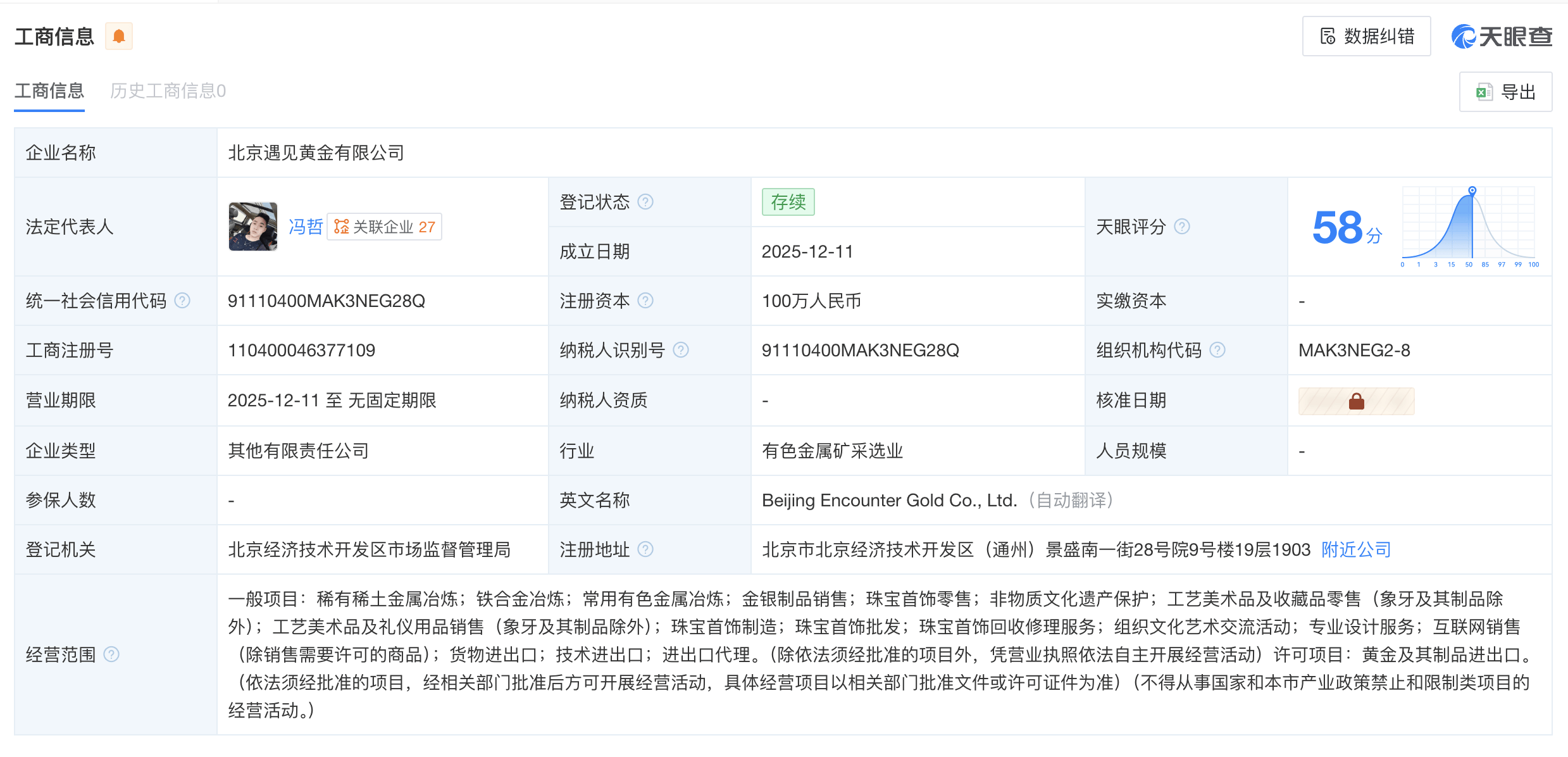 | 企业名称 | 北京遇见黄金有限公司 | | | --- | --- | --- | | 法定代表人 | 冯哲 8 关联企业 27 | 登记状态 ② | | | | 成立日期 | | 统一社会信用代码 ⑦ | 91110400MAK3NEG28Q | 注册资本 2 | | 工商注册号 | 110400046377109 | 纳税人识别号 ⑦ | | 营业期限 | 2025-12-11 至 无固定期限 | 纳税人资质 | | 企业类型 | 其他有限责任公司 | 行业 | | 参保人数 | | 英文名称 | | 登记机关 | 北京经济技术开发区市场监督管理局 | 注册地址 ② | | 经营范围 ⑦ | 一般项目: 稀有稀土金属冶炼; 铁合金冶炼; 常用有色金属) 外);工艺美术品及礼仪用品销售(象牙及其制品除外);珠፺ | | | | (除销售需要许可的商品);货物进出口;技术进出口;进出 | | | | (依法须经批准的项目,经相关部门批准后方可开展经营活动 | | | | 经营活动。) | | 来源:天眼查 北京时间25年12月11日,据天眼查信息显示,北京遇见黄金有限公司在北京经济技术开发区市场监督管理局 ...