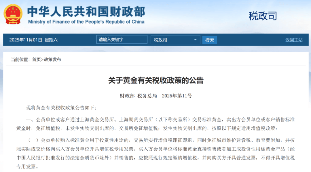 11月1日,财政部、国家税务总局发布关于黄金有关税收政策的公告。该公告自2025年11月1日起实施,执行至2027年12月31日,适用时间以发生实物交割 出库的时间为准。 图源:《财政部 税务总局关于黄金有关税收政策的公告》(财政部 税务总局公告2025年第11号) 对比过往政策,记者发现,此次的重要变化是,黄金税收被分为投资性黄金与非投资性黄金两类税收路径。多位受访人士表示,新政的出台有望推动黄金 行业生态持续向好,目前期待更为明确、更具操作性的实施细则指引出炉。 黄金有关税收迎新政 图源:《财政部 税务总局关于黄金有关税收政策的公告》(财政部 税务总局公告2025年第11号) 具体而言,该公告称,会员单位或客户通过上海黄金交易所、上海期货交易所(以下称"交易所")交易标准黄金,卖出方会员单位或客户销售标准黄金 时,免征增值税。未发生实物交割出库的,交易所免征增值税;发生实物交割出库的,按照规定适用增值税政策。纳税人不通过交易所销售标准黄金,应 按照现行规定缴纳增值税。 该公告所称会员单位,是指按照上海黄金交易所章程注册登记的会员。上海期货交易所适用有关会员单位政策的范围同上。该公告所称客户,是指按照上 海 ...
