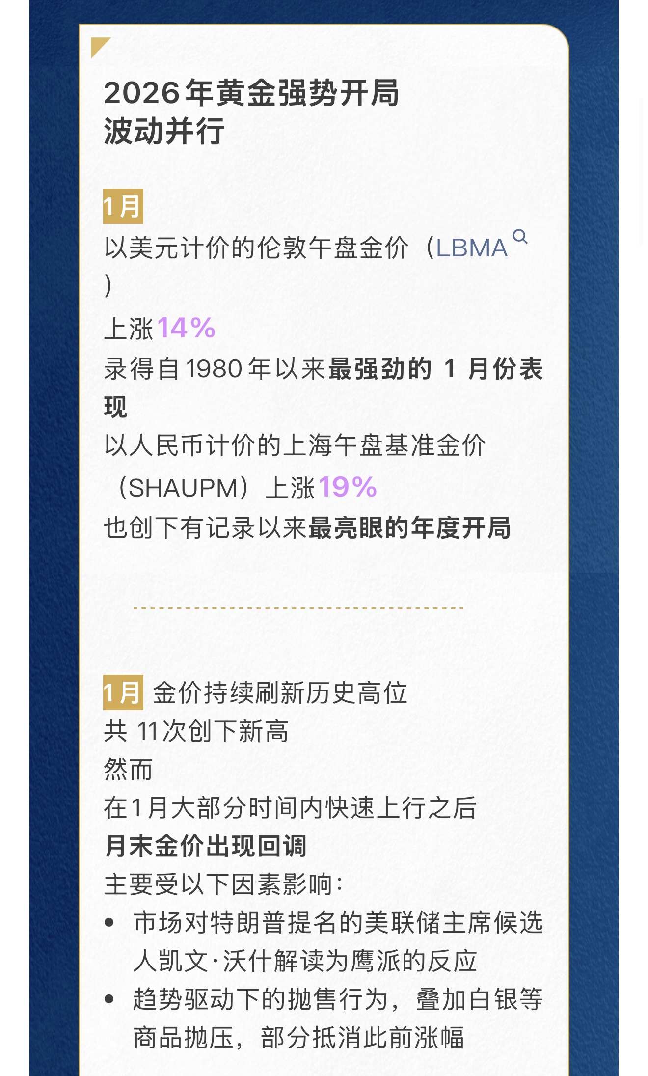 2026年1月中国黄金市场表现 - 2026年1月,中国市场黄金ETF实现资金流入约440亿元人民币,为连续第五个月流入,并创下历史第二高单月流入规模 [1][5] - 受资金流入及金价上涨推动,中国市场黄金ETF的资产管理总规模增至3330亿元人民币,创历史新高,同时持仓量增加38吨至286吨,刷新纪录 [1][5][6] - 1月上海期货交易所黄金期货日均交易量环比增长17%,较其五年均值高出72%,交易量显著上升 [7] 黄金价格动态 - 1月金价在大部分时间内快速上行,但月末出现回调,2月初一度短暂跌破4500美元/盎司,随后重新回升至5000美元/盎司上方 [3] - 金价回调受多重因素影响,包括市场对美联储主席候选人鹰派解读的反应、趋势驱动下的抛售行为以及白银等商品抛压 [3] - 在金价强劲上涨且波动加剧的情况下,部分投资者和消费者保持谨慎,但消费者和投资者可能利用金价回落的机会入场 [3][4] 实物黄金需求 - 1月上海黄金交易所的黄金出库量达126吨,与2025年同期大体持平,月环比增长11% [4] - 上游实物需求受金价上涨带动金条销售、春节前金饰商加大补库力度(尤其是在月末金价回调期间逢低补库)等因素支撑 [4] - 金价快速上涨和波动加剧限制了需求的进一步增长,导致1月交易日日均出库量同比下降10% [4][5] 黄金ETF需求驱动因素 - 推动国内投资者增持黄金ETF的主要动因包括:金价强劲上涨吸引了高度关注、国债收益率走低、全球和区域地缘政治不确定性居高不下 [6] - 此前参与度有限的国内机构投资者对黄金ETF的青睐度有所提升 [6] - 2月初随着金价回落,中国黄金ETF在最初几日出现资金流出,但随后几天需求已有所回升 [7] 央行购金活动 - 中国人民银行连续第15个月购入黄金,1月购入黄金1.2吨 [10] - 截至1月底,中国官方黄金储备占外汇储备总额的9.6% [11] - 央行持续购金传递出重要信号,即在地缘政治风险和多重政策不确定性并存的背景下,黄金作为系统性风险对冲工具的长期作用凸显 [12] 黄金进口情况 - 2025年12月,中国净进口黄金量达29吨,环比减少18吨,同比减少55吨,主要原因为金饰需求不振以及本地金价相对境外出现折价 [16] - 2025年全年,中国黄金净进口量达675吨,较2024年同比下降41%,主要受金饰板块需求疲弱以及本地金价频繁贴水的影响 [16] 未来展望 - 随着春节假期临近,在自我犒赏及礼赠相关消费带动下,金饰购买和金条投资需求或将继续出现季节性改善 [19] - 但金价处于高位,可能继续在一定程度上抑制金饰销量 [19] - 近期金价的快速波动刺激了市场,同时越来越多消费者选择通过“以旧换新”将旧金饰换购成新品,预计此类活动将持续推进并有助于提升中国黄金市场的整体流动性 [20]