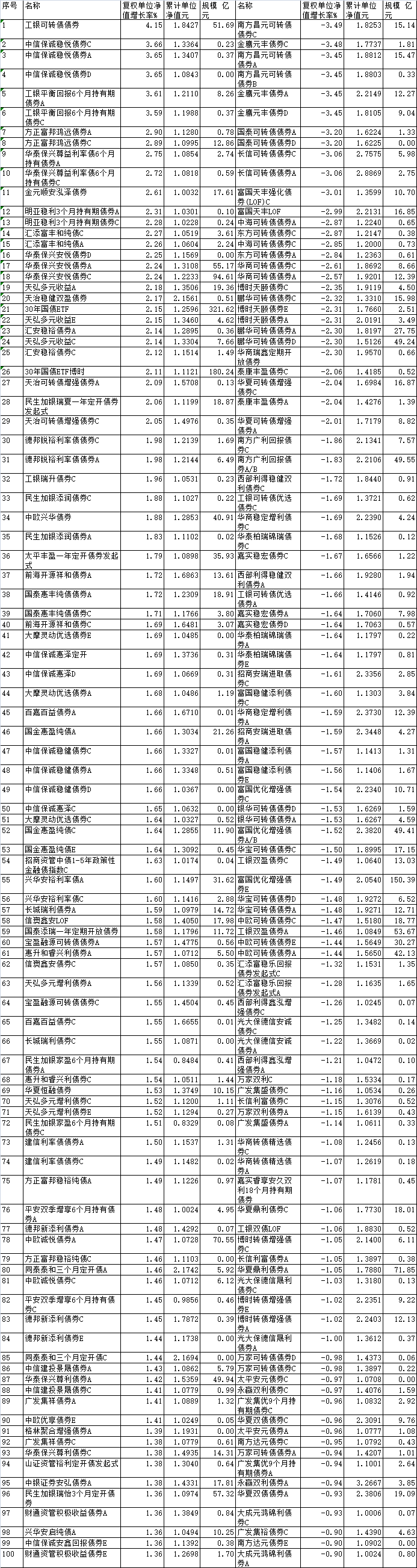 中国经济网北京11月6日讯 (记者 康博) 在刚过去的10月份里,剔除净值异动的债券型基金后, 在7419只(各份额分开计算,下同)有可比业绩的债基中,实现业绩上涨的共有6837只,占比92%。另 有39只持平,543只下跌。 从涨幅榜看,工银可转债债券以4.15%的收益率排名第一,也成为10月份唯一一只涨幅超过4%的债 券型基金。 东方可转债由杨贵宾与徐奥千共同管理,其中,杨贵宾是有着9年管理经验的老将。其曾任富国基 金管理有限公司固定收益研究员、基金经理,上海海通证券资产管理有限责任公司投资主办、固定收益 投资总监、公司总助职位。2019年9月加盟东方基金管理股份有限公司担任公司副总经理、固定收益投 资总监、公募投资决策委员会副主任委员,曾任公司总经理助理,现任基金经理。徐奥千的管理经验也 接近4年。 | 序号 名称 | | 复权单位净 累计单位 规模 亿 | | 名称 | 复权单位净 累计单位 | | 规模 亿 | | --- | --- | --- | --- | --- | --- | --- | --- | | | | 值增长率% 净值元 元 | | | 值揭长率8 | 净值元 | 元 | | | ...