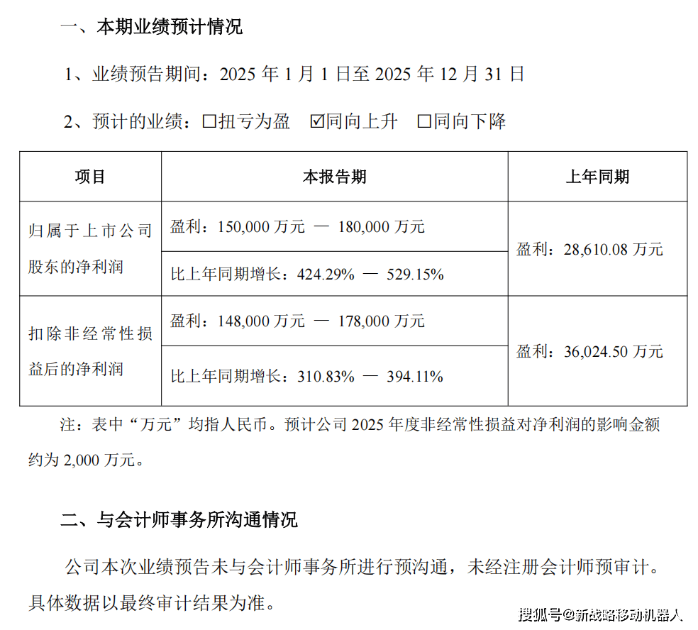 公司2025年业绩预测 - 预计2025年归属于上市公司股东的净利润为15亿元至18亿元,同比增长424.29%至529.15% [1] - 预计2025年扣除非经常性损益后的净利润为14.8亿元至17.8亿元,同比增长310.83%至394.11% [1] - 2025年四季度公司毛利率已实现同比和环比回升 [2] 业绩增长驱动因素 - 2025年全球动力电池市场持续回暖,储能领域需求强劲增长,行业整体需求持续复苏 [1] - 国内头部电池企业开工率提升、扩产节奏有序加快,公司订单规模同比快速回升 [1] - 订单交付与项目验收节奏同步提速,推动了公司经营业绩的筑底回升与快速增长 [1] 公司核心竞争力与经营质量 - 加大新技术、新产品、新工艺的研发创新力度,持续巩固在固态电池、钠离子电池、钙钛矿、BC电池、3C等智能装备领域的先发优势 [2] - 积极挖掘并延展相关领域的业务拓展机遇,进一步拓宽潜在业绩增长点 [2] - 深化数字化转型,推进全流程降本增效,运营效率与盈利水平均实现有效提升 [2] 现金流与经营状况 - 2025年全年经营现金流回款情况显著改善 [2] - 公司秉持以客户为中心的经营理念,持续优化产品和服务质量,加快设备验收及回款进度 [2] - 公司经营韧性进一步增强 [2] 行业与市场地位 - 公司在新能源智能装备领域的龙头地位进一步巩固 [1] - 整体盈利能力明显提升 [1]