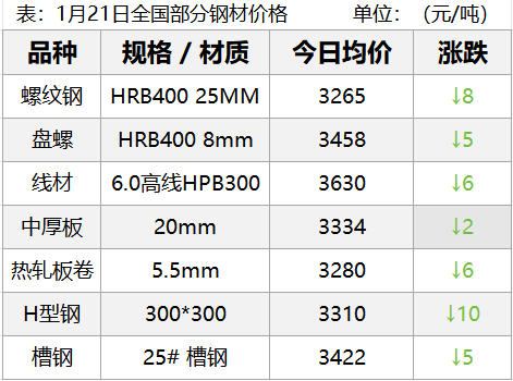 多空因素分析 - 财政部等多部门释放系列贴息政策及民间投资专项担保计划 2026年财政总体支出“只增不减” 旨在支持稳就业、稳企业、稳市场、稳预期 政策有利于提振市场信心 利好钢材价格走势 [2] - 开封市、德州市、济源市、聊城市自2026年1月21日8时起启动重污染天气橙色预警 河北邢台市自1月22日12时启动橙色应急响应 多地启动Ⅱ级响应将限制区域钢厂产能 收缩供应支撑钢价 [3] - 据CME“美联储观察” 美联储1月维持利率不变的概率为95% 到3月累计降息25个基点的概率为20.6% 维持利率不变的概率为78.5% 美联储1月维持利率不变压制全球流动性宽松预期 削弱大宗商品估值与钢材需求预期 短期对钢价形成情绪与资金面压制 [4] 钢材市场行情 - 1月21日钢材现货市场小幅下跌 成交量偏弱 [5] - 全国部分钢材现货价格下跌 螺纹钢(HRB400 25MM)均价3265元/吨 跌18元/吨 热轧板卷(5.5mm)均价3280元/吨 跌16元/吨 H型钢(300*300)均价3310元/吨 跌110元/吨 [6] - 期货市场主要品种主力全部下跌 螺纹钢主连跌0.35% 热卷主连跌0.06% 铁矿石主连跌0.32%至784.0元/吨 焦炭主连跌0.59%至1683.5元/吨 焦煤主连跌1.83%至1129.0元/吨 [7][8] - 据不完全统计 1月21日有4家钢厂调整建材出厂价格 其中3家下调线材、螺纹等价格20元/吨 1家上调线材和盘螺价格20元/吨 [9] 原燃料市场动态 - 进口铁矿主流品种市场价格较上一工作日小幅下跌 发运与到港下降但仍处高位 铁水产量微降 钢厂日耗回落 港口库存持续增加 加西芒杜矿到港压力渐显 节前补库预期形成一定支撑 但总体供强需弱 [10] - 焦炭价格平稳运行 焦企盈利压缩但开工尚可 铁水略有回落 钢厂采购节奏放缓 春节前下游补库对双焦有一定支撑 但淡季终端需求走弱 铁水增量空间有限 [10] - 废钢价格小幅下跌10-20元/吨 多数钢厂仍处亏损状态 短流程电炉厂开工率处于低位 供应收缩和相较于铁水的性价比优势构成支撑 但北方需求停滞和全行业盈利薄弱压制价格上涨空间 [10] - 唐山迁安普方坯资源出厂含税报2950元/吨 全国钢坯价格走弱 期螺震荡偏弱 下游成材整体成交偏弱 [10] 综合市场观点 - 受大范围寒潮和冰冻天气影响 钢市成交量已持续数日下降 多地启动重污染天气应急响应后 期价逐步企稳回升 [11] - 基本面看 国内宏观政策发力与多地重污染天气预警限产形成支撑 但美联储维持利率不变压制市场情绪 叠加厂库和社库高位累积 市场进入传统淡季 需求持续走弱 [11] - 原燃料方面 铁矿、焦煤、焦炭价格走弱 成本支撑有所下移 [11] - 综合来看 钢价上行乏力但下方存在限产与补库预期支撑 预计明日钢价持稳个涨 幅度0-10元/吨 [11]