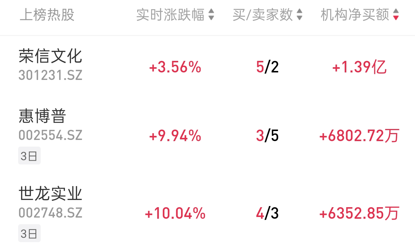 龙虎榜机构热股 今天机构龙虎榜上榜27只个股,净买入11只,净卖出16只。当日机构买入最多的个股前三位是:荣信文化(1.39亿)、惠博普(6802万)、世龙实业(6352 万) | 上榜热股 | 实时涨跌幅♀ 买/卖家数♀ | | | --- | --- | --- | | 荣信文化 | +3.56% | 5/2 | | 301231.SZ | | | | 惠博普 | | | | 002554.SZ | +9.94% | 3/5 | | 3日 | | | | 世龙实业 | | | $$2748.5Z\qquad\qquad+10.04\%\qquad\qquad4/3$$ 惠博普 龙虎榜显示,今日3家机构净买入6802万。 公司主营业务包括油气工程及服务、油气资源开发及利用等,已取得阿联酋、科威特、伊拉克、库尔德斯坦等国家与地区的多家石油、天然气公司的准入资 格 一、深地经济 神开股份 公司为中部最大、全国十强的玻璃生产企业,实控人已变更为宜昌市国资委 个股龙虎榜 公司主导产品涵盖钻采装备、钻完井工具、集输装备三大领域,覆盖陆地和海洋油气田,具体包括钻头钻具、钻井装备等 中证报认为,随着陆地浅部资源的日益枯竭 ...