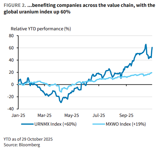 巴克莱认为,铀市场供应端高度集中,哈萨克斯坦占全球产量近40%,俄罗斯控制约40%加工产能,地缘政治风险显著;需求端受核能超级周期推动, 预计2040年全球铀需求将增长124%至3.91亿磅。铀供应难以快速响应,最早2032年将现供应赤字。 全球核能复兴浪潮正将铀推至多年牛市的起点。 11月4日,巴克莱在最新研报中称,铀市场正迎来结构性供需失衡,地缘政治风险与核能超级周期的双重推动下,多年铀牛市的条件已经成熟。当前的 市场格局呈现出两大核心特征: 极度集中的供应端和需求激增的需求端 ,这两者共同指向了 一个多年的铀牛市 。 研报称, 铀供应的地理集中度创造了显著的地缘政治风险。 仅哈萨克斯坦就占据全球铀产量的近40%,而俄罗斯控制约40%的铀加工和浓缩产能。这 种供应链集中度在地缘政治紧张局势加剧的背景下,正迫使各国重新审视铀供应安全。 同时, 需求端的增长动力来自核能超级周期的全面启动。 世界核协会预测,全球铀需求将从2024年的1.75亿磅激增至2040年的3.91亿磅,增幅达 124%。美国核能重启、中国核电扩张以及小型模块化反应堆的兴起,共同构成了这一需求增长的核心驱动力。 巴克莱强调,市场定价已开始 ...