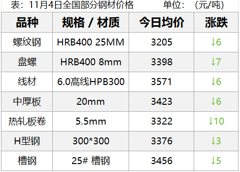 | 投资咨询业务资格:证监许可 [2011] 1292号 2025年11月4日 | 网材产业期现日报 | | 問敏波 | Z0010559 | | | --- | --- | --- | --- | --- | --- | | 钢材价格及价差 | | | | | | | 品种 | 现值 | 削值 | 涨跌 | 基差 | 单位 | | 螺纹钢现货(华东) | 3220 | 3230 | -10 | 141 | | | 螺纹钢现货(华北) | 3190 | 3190 | O | 111 | | | 螺纹钢现货(华南) | 3310 | 3320 | -10 | 231 | | | 螺纹钢05合约 | 3145 | 3166 | -21 | 75 | | | 螺纹钢10合约 | 3168 | 3189 | -21 | 52 | | | 螺纹钢01合约 | 3079 | 3106 | -27 | 141 | | | 热卷现货(华东) | 3310 | 3330 | -20 | 15 | 元/吨 | | 热卷现货(华北) | 3230 | 3250 | -20 | -୧2 | | | 热卷现货(华南) | 3310 | ...