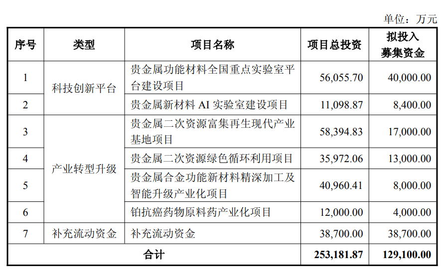 融资计划 - 公司拟向特定对象发行A股股票募集资金总额不超过12.91亿元[1] 资金投向 - 募集资金扣除发行费用后拟投资于贵金属功能材料全国重点实验室平台建设项目[1] - 募集资金拟投资于贵金属新材料AI实验室建设项目[1] - 募集资金拟投资于贵金属二次资源富集再生现代产业基地项目[1] - 募集资金拟投资于贵金属二次资源绿色循环利用项目[1] - 募集资金拟投资于贵金属合金功能新材料精深加工及智能升级产业化项目[1] - 募集资金拟投资于铂抗癌药物原料药产业化项目[1] - 募集资金拟用于补充流动资金[1]