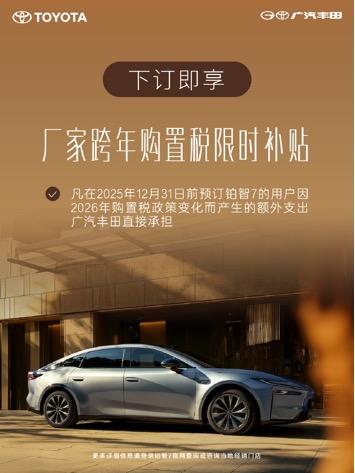 行业背景与市场动态 - 面对明年新能源车购置税补贴退坡,消费端观望情绪渐浓 [1] - 购车决策关键在于锁定成本与价值 [1] 公司市场策略与促销活动 - 广汽丰田铂智7推出“跨年购置税限时补贴”,承诺12月31日前下订,因明年购置税政策变化而产生的额外支出由公司直接承担 [1] - 该举措相当于为消费者提前锁定一份“万元级确定性” [1] - 巡展车在全国131城开启提前品鉴,现场人气印证了其“20万级定价、百万级体验”的高价值吸引力 [1] 产品核心配置与性能 - 驾控上搭载百万级豪车同款的双腔空悬+SDC减振器+华为DriveONE电驱 [1] - 智能层面采用鸿蒙座舱5.0,带来类手机的零层级交互与强大生态扩展能力 [1] - 配合Momenta R6强化学习大模型高阶智驾,构建了实用且领先的智能体验 [1] - 产品拥有超5米车长、NASA推荐角度零重力座椅及雅马哈音响等舒适配置 [1] 行业首创的保障政策 - 公司推出“厂家三担责”政策,包括电车自燃担责、智能泊车辅助事故担责、电池衰减担责 [1] - 该政策将品质保障转化为长期信用 [1] 消费者价值主张 - 当前节点不仅关乎节省万元购置税,更是一个以现时成本锁定越级配置与更早提车的价值窗口 [2] - 在政策红利截止前亲身体验并果断决策,是当下最具确定性的购车选择 [2]