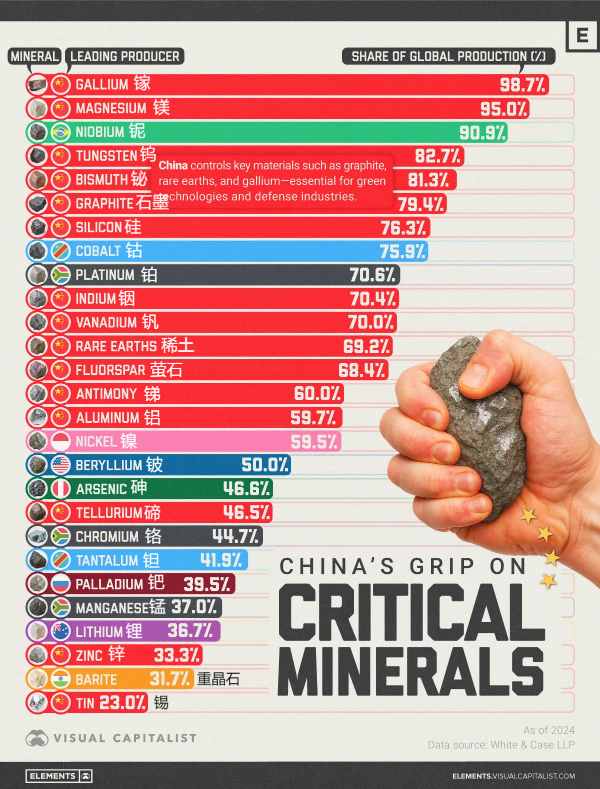 除了稀土,中国大约在27种关键矿产领域占据主导地位!镓(占比98.7%)、镁(95%)、钨(82.7%)和稀土(69.2%)