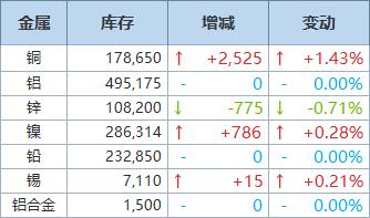 LME金属库存总览 - 伦敦金属交易所(LME)总库存数据显示,铜库存为178,650吨,单日增加2,525吨,增幅1.43% [1] - 铝库存为495,175吨,铅库存为232,850吨,锌库存为108,200吨,镍库存为286,314吨,锡库存为7,110吨,铝合金库存为1,500吨 [1] - 锌库存单日减少775吨,降幅0.71%,镍库存单日增加786吨,增幅0.28%,锡库存单日增加15吨,增幅0.21%,铝、铅及铝合金库存无变动 [1] 注册与注销仓单情况 - 铜的注册仓单为155,725吨,单日大幅增加11.99%,注销仓单为22,925吨,单日大幅减少38.17%,注销占比为12.83% [2] - 铝的注册仓单为440,650吨,注销仓单为54,525吨,注销占比为11.01% [2] - 锌的注册仓单为96,425吨,单日微降0.03%,注销仓单为11,775吨,单日减少5.99%,注销占比为10.88% [2] - 镍的注册仓单为275,166吨,单日增加0.29%,注销仓单为11,148吨,注销占比为3.89% [2] - 铅的注册仓单为217,025吨,单日减少0.16%,注销仓单为15,825吨,单日增加2.26%,注销占比为6.80% [2] - 锡的注册仓单为6,750吨,单日增加0.30%,注销仓单为360吨,单日减少1.37%,注销占比为5.06% [2] 分仓库铜库存变化 - 铜库存主要增加地:新奥尔良仓库库存增加1,575吨至13,475吨,巴尔的摩仓库库存增加1,175吨至4,625吨,新加坡仓库库存增加425吨至6,700吨,釜山(原文“ हैं।”,疑为釜山)仓库库存增加250吨至20,750吨 [4] - 铜库存主要减少地:高雄仓库库存减少450吨至81,050吨,光阳仓库库存减少375吨至26,375吨,鹿特丹仓库库存减少75吨至10,450吨 [4] - 注销仓单占比较高的仓库:光阳仓库注销占比达24.64%,高雄仓库注销占比为17.09%,釜山仓库注销占比为9.64% [4] 分仓库铝库存情况 - 铝库存整体无变动,主要库存集中在巴生港(305,500吨)和光阳(138,400吨) [6] - 注销仓单占比较高的仓库:鹿特丹仓库注销占比为28.99%,巴生港仓库注销占比为17.37% [6] 分仓库铅库存情况 - 铅库存整体无变动,绝大部分库存位于新加坡仓库(232,200吨) [8] - 毕尔巴鄂和巴塞罗那仓库各有少量注销仓单,注销占比均为100% [8] 分仓库锌库存变化 - 锌库存整体减少775吨,主要减少地:高雄仓库库存减少675吨至24,525吨,新加坡仓库库存减少50吨至73,200吨,仁川(原文“一生活”,疑为仁川)仓库库存减少50吨至1,875吨 [10] - 注销仓单占比较高的仓库:高雄仓库注销占比达25.18%,仁川仓库注销占比为22.67% [10] 分仓库锡库存变化 - 锡库存整体增加15吨,全部增长来自巴生港仓库(增加15吨至2,915吨) [12] - 注销仓单占比较高的仓库:毕尔巴鄂仓库注销占比为13.33%,鹿特丹仓库注销占比为9.57%,高雄仓库注销占比为6.40% [12]