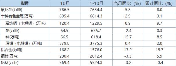 | 指标 | 10月 | 1-10月 | 当月同比(%) 累计同比(%) | | | --- | --- | --- | --- | --- | | 氧化铝(万吨) | 786.5 | 7634.4 | 5.8 | 8.0 | | 十神有色金属(万吨) | 695.4 | 6814.3 | 2.9 | 3.1 | | 精炼铜(电解铜)(万吨) | 120.4 | 1229.5 | 8.9 | 9.7 | | 铝(万吨) | 64.5 | 635.7 | -2.4 | 0.3 | | 锌(万吨) | 66.5 | 618.4 | 15.7 | 8.5 | | 原铝(电解铝)(万吨) | 379.8 | 3775.3 | 0.4 | 2.0 | | 铝合金(万吨) | 168.2 | 1576.0 | 17.2 | 15.7 | | 铜材(万吨) | 200.4 | 2012.4 | -3.3 | 5.9 | | 铝材(万吨) | 569.4 | 5524.3 | -3.2 | -0.4 | 数据来源:国家统计局 国家统计局11月18日发布的数据显示,中国2025年10月精炼铜(电解铜)产量为120.4万吨,同比 ...