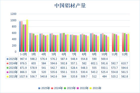 国家统计局发布报告显示,中国2025年10月中国铝材产量为569.4万吨,环比下滑3.5%,同比下滑 3.2%。1-10月中国铝材产量为5524.3万吨,同比微落。10月铝价重心上移,需求表现平淡,铝材产量环 比下滑。 ...