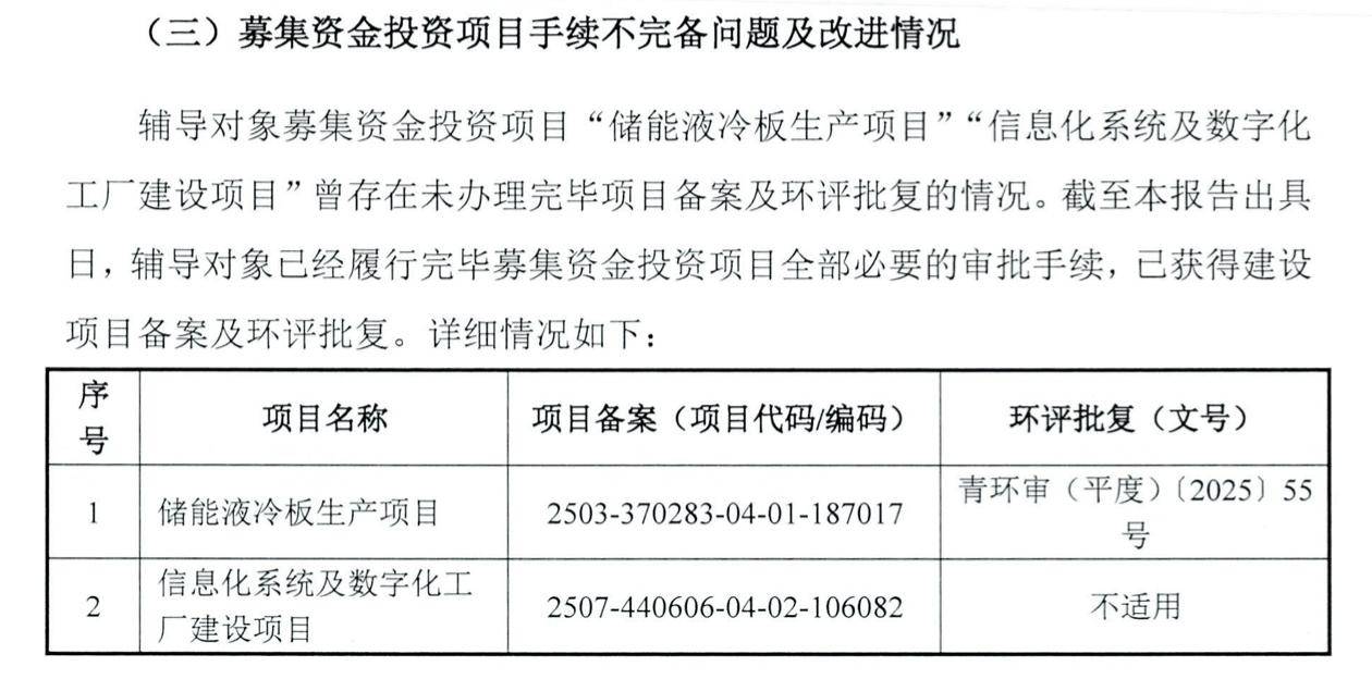 IPO辅导进展 - 公司于2022年10月28日启动北交所IPO,辅导机构为中泰证券股份有限公司 [1] - 公司已完成北交所IPO辅导工作 [1] 募投项目合规情况 - 公司募集资金投资项目“储能液冷板生产项目”和“信息化系统及数字化工厂建设项目”曾存在未办理完毕项目备案及环评批复的情况 [1] - 截至报告出具日,公司已履行完毕募集资金投资项目的全部必要审批手续,获得建设项目备案及环评批复 [1] - “储能液冷板生产项目”已完成备案和环评批复,项目代码为2503-370283-04-01-187017 [3] - “信息化系统及数字化工厂建设项目”已完成备案,项目代码为2507-440606-04-02-106082,环评批复为不适用 [3] 公司业务与产品 - 公司是一家高新技术企业,专注于研发、生产和销售应用于空调、冷链物流等领域的制冷系统定制化管件、阀门及其他配件 [3] - 公司主要产品包括铜管件、铝管件及截止阀等 [3]