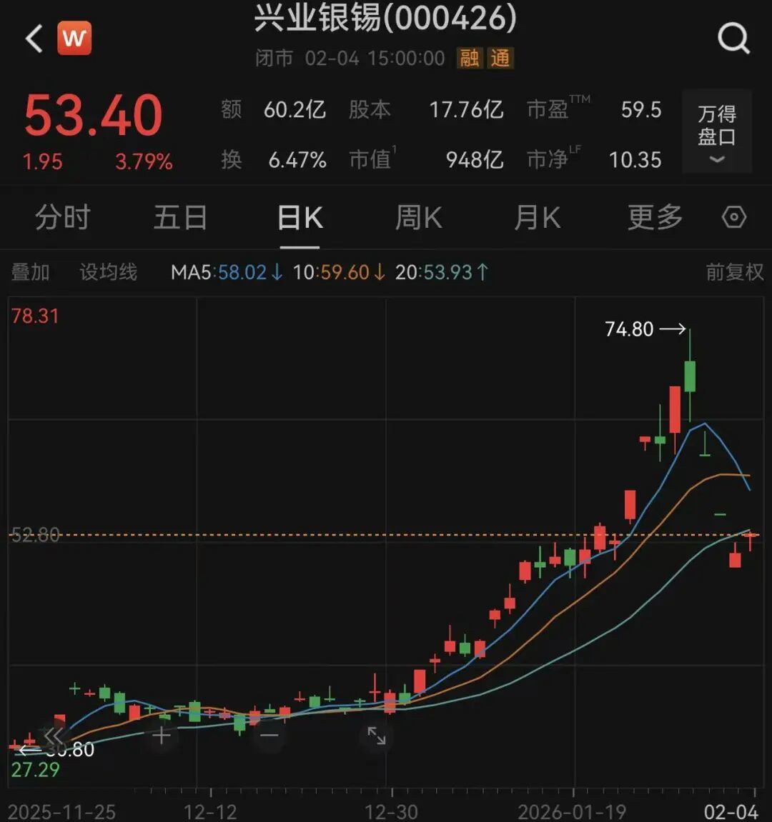 公司高管增持与持股情况 - 兴业银锡董秘孙凯在2026年2月3日公司股价第三个跌停时增持4万股,增持均价49.83元/股,增持金额199.32万元[3][4] - 此次增持后,孙凯总持股数量达到24万股,持股市值超过1200万元[1][4] - 孙凯自2014年以来共进行六次增持,总投入金额不超过357.2万元,截至2026年2月3日收盘,其持股市值达1234.8万元,浮盈近900万元[1][8] - 仅计算前五次增持的20万股,其市值已超过1000万元,浮盈超过5倍[8] 公司股价近期表现 - 2026年1月30日、2月2日及2月3日开盘,兴业银锡股价连续跌停[1][4] - 2026年2月3日,股价以跌停价49.83元开盘,午后打开跌停,收盘下跌7.08%至51.45元,市值超过900亿元[4] - 截至2026年2月4日收盘,公司股价收于53.40元,市值达948亿元[2] - 2025年公司股价全年涨幅高达222.2%,2026年年内最高涨幅超过100%[9] 公司历史业绩与近期财务表现 - 公司主营业务为有色金属及贵金属采选与冶炼,产品包括银、锡、锌、铅等[8] - 2022年至2024年,公司营业收入分别为20.86亿元、37.06亿元和42.70亿元,净利润分别为1.74亿元、9.69亿元和15.30亿元[8] - 2025年前三季度,公司实现营业收入40.99亿元,同比增长24.36%,实现净利润13.64亿元,同比增长4.94%[9] 公司信息披露评价历史 - 孙凯自2011年12月起担任公司董事会秘书[1][5] - 2011年至2024年,公司信息披露评价最高为B,2018年为D,2019年至2024年连续六年为C[1][9] - 2019年8月,公司因2018年业绩预告大幅修正但风险提示不充分收到监管函,董秘孙凯被认定负有责任[9] - 公司解释近年信息披露评级为C主要系控股股东股权质押率高于80%所致,而非信息披露工作本身存在问题[11]