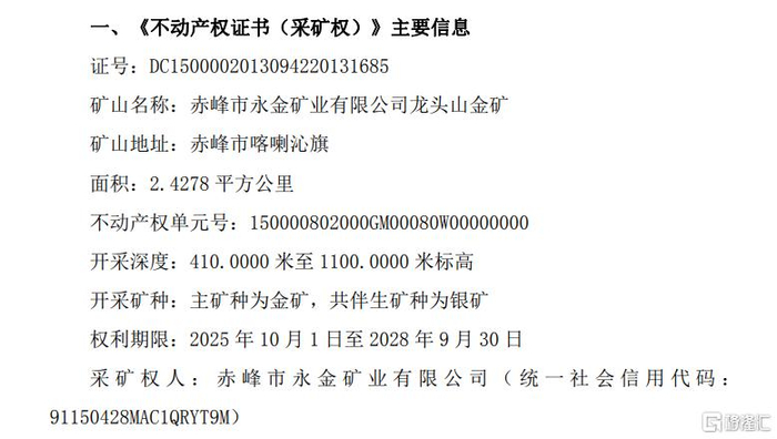 格隆汇11月16日丨恒星科技(002132.SZ)发布公告,公司全资子公司赤峰市永金矿业有限公司于2025年 11月14日收到赤峰市自然资源局颁发的《不动产权证书(采矿权)》。 开采深度:410.0000 米至 1100.0000 米标高 开采矿种:主矿种为金矿,共伴生矿种为银矿 权利期限:2025年10月1日至2028年9月30日 采矿权人:赤峰市永金矿业有限公司(统一社会信用代码: 91150428MAC1QRYT9M) 一、《不动产权证书(采矿权)》主要信息 证号: DC1500002013094220131685 矿山名称:赤峰市永金矿业有限公司龙头山金矿 矿山地址:赤峰市喀喇沁旗 面积:2.4278 平方公里 不动产权单元号:150000802000GM00080W00000000 国商社 ...