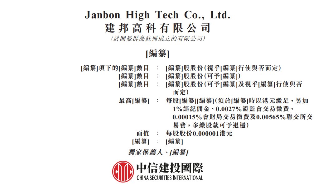 智通财经APP获悉,据港交所11月6日披露,建邦高科有限公司(简称:建邦高科)向港交所主板提交上市 申请,中信建投国际为其独家保荐人。此前报道显示,建邦高科于5月2日所递交的港股招股书满6个 月,于11月2日失效。 年内利润 | [编纂]項下的[编纂]數目 | : | [编纂]股股份(視乎[编纂]行使與否而定) | [编纂]數目 | [编纂]股股份(可予[编纂]) | : | | --- | --- | --- | --- | --- | --- | | 编纂 數目 | [编纂]股股份(可予[编纂]及視乎]编纂]行使與否 | .. | 而定) | | | | 最高[編纂] : 每股[編纂](須於[編纂]時以港元繳足,另加 | 1%經紀佣金、0.0027%證監會交易徵費、 | | | | | | 0.00015%會財局交易徵費及0.00565%聯交所交 | 易費,多繳股款可予退還) | | | | | | 面值 | 每股股份0.000001港元 | | 【编纂】: 编纂】 | | | | 獨家保薦人、[編纂] | | | | | | 招股书披露,建邦高科是中国知名的银粉供应商,拥有逾十多年的运营经验,集研究、开 ...