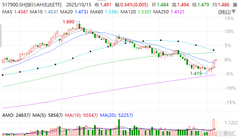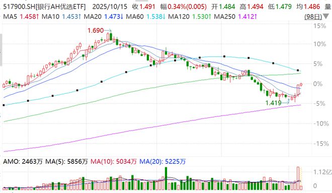 银行股探底回升,中证银行指数盘中回踩年线,工行一度跌超2%!资金连续4日增仓银行AH优选ETF(517900)