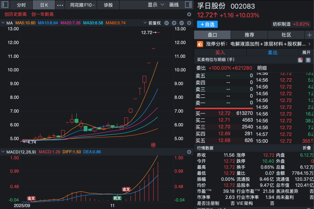 公司股价表现 - 公司股票自11月3日至11月17日连续收获8个涨停板,累计涨幅达112.35% [1] - 11月17日公司股价涨停收盘,报收12.72元,当日涨幅为10.03% [2] - 公司股价创下历史新高,并突破多条重要均线(MA5: 10.60, MA10: 8.64, MA20: 7.26, MA30: 6.58, MA60: 5.74) [2] - 公司当前总市值为120.41亿元,流通市值为120.37亿元 [2] 公司业务与基本面 - 公司子公司孚日新能源的锂电池电解液添加剂项目于2021年投资建设 [1] - 2025年前三季度,孚日新能源实现营业收入16839.81万元,占公司前三季度营业收入的4.38% [1] - 孚日新能源业务收入占公司主营业务收入比例较小,对公司业绩影响有限 [1] - 孚日新能源目前暂无扩产计划,对公司其他业务布局不产生重大影响 [1] 市场交易情况 - 公司公告指出股价严重异常波动,已严重偏离公司基本面,可能存在非理性炒作 [1] - 11月17日股票换手率为0.65%,成交总量为6.12万手,成交金额为7784.15万元 [2] - 公司股票动态市盈率为39.18倍,高于行业平均市盈率21.58倍 [2] - 公司股票市净率为2.63倍,高于行业平均市净率1.94倍 [2]