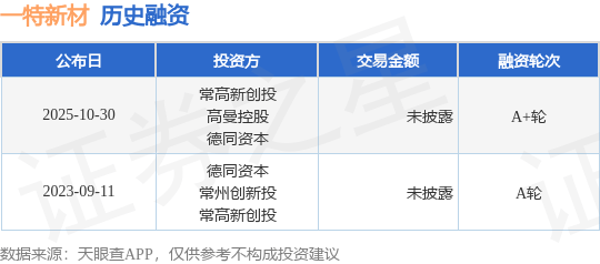 公司融资信息 - 江苏一特新材料有限责任公司于2025年10月30日完成A+轮融资,参与投资的机构包括常高新创投、高曼控股和德同资本 [1][2] - 公司此前在2023年9月11日完成A轮融资,投资方包括德同资本、常州创新投和常高新创投 [2] - 两轮融资的具体交易金额均未披露 [1][2] 公司业务与定位 - 公司是一家位于长三角新能源之都江苏常州的科技企业,专注于锂电池高分子功能材料的研发和生产 [2] - 主要客户覆盖国内一线锂电池企业 [2] - 公司注重技术研发和创新,建立了锂电池专用高分子材料表征实验室、合成实验室和中试实验室 [2] 生产运营与质量体系 - 公司拥有全自动化的生产线和检测设备 [2] - 生产运营流程按照ISO9001和AITF16949质量管理体系进行严格规范和完善 [2] - 公司以确保产品性能和质量的精益求精为目标,致力于为客户提供高质量的产品与新能源材料解决方案 [2]