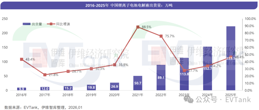 EVTank:2025年中国电解液出货量223.5万吨 行业迎来价量齐升新阶段