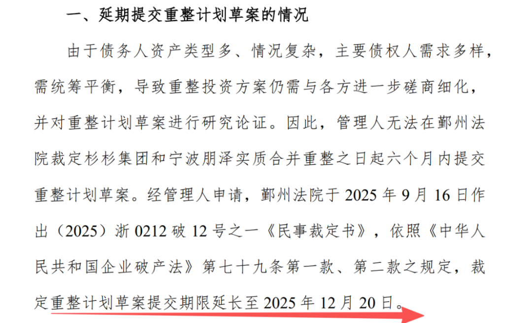 备受关注的杉杉集团重整,再生变化。 上海证券报记者从知情人士处了解到,杉杉集团有限公司(简称"杉杉集团")及其全资子公司宁波朋泽贸易有限公司(简称"朋泽贸易")实质合并重整案 第二次重整投资人招募已于12月18日进行现场述标。 记者获得的一份"投资人情况汇总表"显示,参与杉杉集团二次重整投资人招募的意向投资人共有12组,大部分为联合体,涉及企业总数超20家,包括方大 炭素、中国宝安、天齐锂业、TCL科技、京东方、湖南盐业集团等。 "述标前,方大炭素、湖南盐业集团、天齐锂业等5组意向投资人退出了,最终是7组意向投资人提交方案进入述标。"上述知情人士透露。 对此,有接近方大炭素的人士向记者表示,不确定公司是否退出此次杉杉重整,但公司前期已经缴纳了保证金,并进行了相关尽职调查工作。 据宁波市鄞州区人民法院2025年9月16日作出的民事裁定书,杉杉集团重整计划草案提交期限延长至2025年12月20日。目前这一时间节点将近,重整投资 人遴选结果尚未披露。 图片来源:中航证券有限公司关于杉杉集团有限公司及全资子公司实质合并重整案之临时受托管理事务报告 谁将最终脱颖而出,成为杉杉集团的重整投资人?又能否平衡各方债权人合理诉 ...
