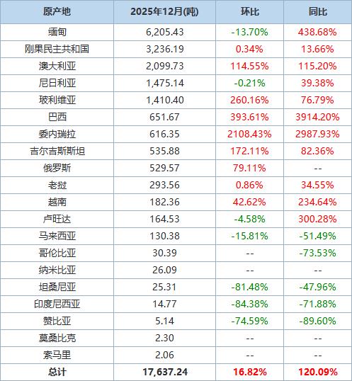 以下为根据中国海关总署官网数据整理的2025年12月锡矿砂及其精矿进口分项数据一览表: | 原产曲 | 2025年12月(吨) | 环比 | 同比 | | --- | --- | --- | --- | | 缅甸 | 6.205.43 | -13.70% | 438.68% | | 刚果民主共和国 | 3.236.19 | 0.34% | 13.66% | | 澳大利亚 | 2.099.73 | 114.55% | 115.20% | | 尼日利亚 | 1.475.14 | -0.21% | 39.38% | | 玻利维亚 | 1,410.40 | 260.16% | 76.79% | | 田中 | 651.67 | 393.61% | 3914.20% | | 委内瑞拉 | 616.35 | 2108.43% | 2987.93% | | 吉尔吉斯斯坦 | 535.88 | 172.11% | 82.36% | | 俄罗斯 | 529.57 | 79.11% | | | 老挝 | 293.56 | 0.86% | 34.55% | | 越南 | 182.36 | 42.62% | 234.64% | | 卢 ...