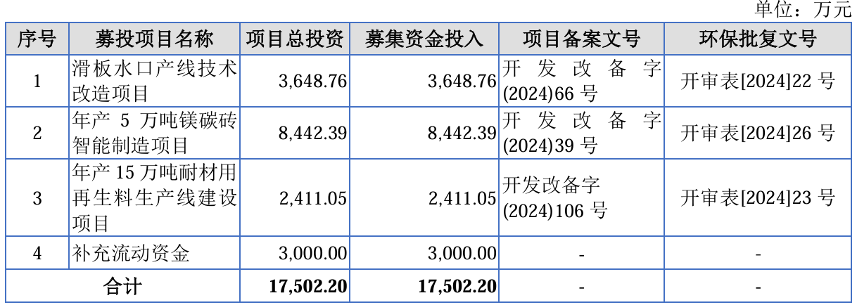 发行结果概览 - 公司完成向不特定合格投资者公开发行股票并在北京证券交易所上市 发行股份全部为新股 发行数量为1,804.4853万股 发行后总股本为8,363.4491万股 本次公开发行股份数量占发行后总股本的21.58% [1] - 本次发行战略配售数量为180.4485万股 占本次发行规模的10.00% 发行价格为10.76元/股 战略配售募集资金合计1,941.63万元 共有5家战略投资者参与 [1] - 本次发行网上申购异常踊跃 有效申购数量为769.588306亿股 冻结资金约8,280.77亿元 有效申购户数为728,083户 网上有效申购倍数高达4,738.74倍 最终网上获配户数为88,524户 获配股数为1,624.0368万股 获配金额为1.747亿元 网上获配比例仅为0.0211% [1] 公司业务与行业地位 - 公司成立于2002年11月 是一家专注于为高温工业提供耐火材料整体解决方案的高新技术企业 主要业务包括耐火材料整体承包服务及耐火材料产品销售 [2] - 公司核心产品涵盖钢包砖、滑板水口、镁碳砖、透气砖等多个品类 产品广泛应用于钢铁、水泥、玻璃等高温工业领域 是支撑下游行业稳定运行的核心基础材料供应商 [2] - 公司凭借技术、区位及行业经验优势 与德龙钢铁、津西钢铁、燕山钢铁、首钢集团、河钢股份等众多国内知名钢铁企业建立了长期合作关系 业务立足唐山并辐射全国 同时已开拓俄罗斯、越南等海外市场 [2] 募集资金情况与用途 - 公司本次发行预计募集资金总额为1.91亿元 扣除预计发行费用约0.19亿元后 预计募集资金净额约为1.75亿元 与公司披露的募集资金需求金额1.75亿元一致 [2] - 募集资金在扣除发行费用后 将全部用于主业升级与绿色产能扩张 具体投向包括“滑板水口产线技术改造项目”、“年产5万吨镁碳砖智能制造项目”、“年产15万吨耐材用再生料生产线建设项目”以及补充流动资金 [3]