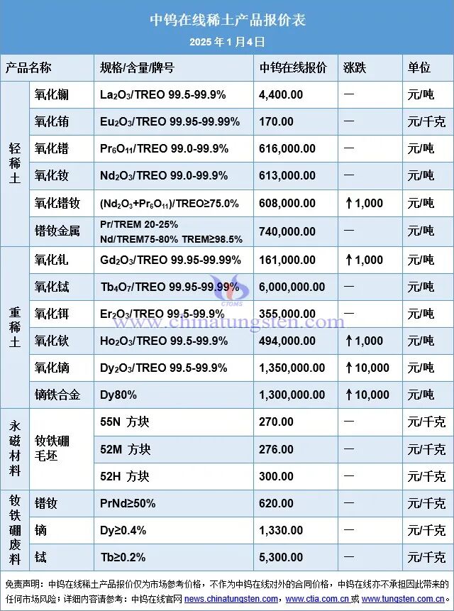 稀土市场行情与价格动态 - 2026年1月4日,国内稀土市场整体维持横盘运行,买卖双方价格博弈激烈,产品价格在窄幅区间波动,实际成交量偏少 [1][5] - 当日部分稀土产品价格出现上涨,其中氧化镨钕报价为608,000元/吨,上涨1,000元/吨;氧化钬报价为494,000元/吨,上涨1,000元/吨;镝铁合金(Dy80%)报价为1,300,000元/吨,上涨10,000元/吨 [1][4][5] - 市场需求释放受到抑制,主要原因是下游生产企业流动资金承压、原料库存较多,同时原料现货供应较为充足 [1][5] 关键稀土产品具体报价 - 轻稀土产品中,氧化镨报价616,000元/吨,氧化钕报价613,000元/吨,镨钕金属(Pr/TREM 20-25%, Nd/TREM75-80%)报价740,000元/吨 [1][4] - 中重稀土产品中,氧化钆报价161,000元/吨(上涨1,000元/吨),氧化铽报价6,000,000元/吨,氧化镝报价1,350,000元/吨(上涨10,000元/吨),氧化铒报价355,000元/吨 [1][4] - 稀土永磁材料毛坯方面,52M方块报价276元/千克,52H方块报价300元/千克;磁材用镨钕(PrNd≥50%)报价620元/千克,镝(Dy≥0.4%)报价1,330元/千克,铽(Tb≥0.2%)报价5,300元/千克 [1][4] 稀土永磁材料技术进展 - 安徽大学研究团队联合北京工业大学及稀土永磁材料全国重点实验室,在稀土永磁材料领域取得重要理论进展 [2][5] - 该研究首次揭示了影响重稀土扩散效率的两大关键微观机制,为提升战略重稀土的利用效率提供了新的科学视角 [2][6] - 相关研究成果已发表于材料学科知名期刊《先进功能材料》 [2][6]
