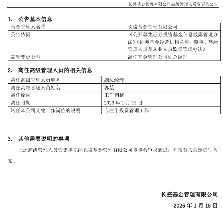 1月15日,长盛基金发布关于高级管理人员变更公告,公司副总经理郭堃因"工作调整"于2026年1月13日离任,未来将"专注于投 资管理工作"。这位2021年升任副总的投资老将,就此卸下高管职务,回归纯粹基金经理角色。 | 基金管理人名称 | 长盛基金管理有限公司 | | --- | --- | | 公告依据 | 《公开募集证券投资基金信息披露管理办 | | | 法》《证券基金经营机构董事、监事、高级 | | | 管理人员及从业人员监督管理办法》 | | 高管变更类型 | 离任基金管理公司副总经理 | | 离任高级管理人员职务 | 副总经理 | | --- | --- | | 离任高级管理人员姓名 | 郭堃 | | 离任原因 | 工作调整 | | 离任日期 | 2026年1月13日 | | 转任本公司其他工作岗位的说明 | 专注于投资管理工作 | 图片来源:长盛基金公告 回顾公募基金行业的发展历程,"投而优则仕"一度是绩优基金经理主流晋升路径。基金公司为挽留核心投研人才、肯定其业绩贡 献,往往将高管职位作为重要激励手段,由此催生了一批兼具基金经理与副总经理双重身份的行业中坚力量。汇丰晋信基金的陆 彬、嘉实基金的姚 ...
