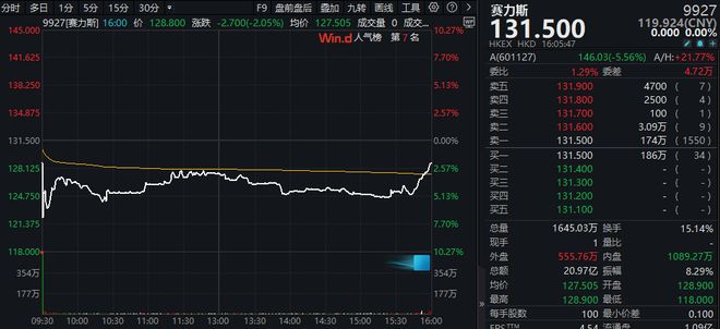 | | | | | 分时 五日 日K 周K 月K 季K 年K 120分 60分 30分 15分 5分 1分 | | | | | | 区间统计 | | 全屏显示 | | --- | --- | --- | --- | --- | --- | --- | --- | --- | --- | --- | --- | --- | | 均价:126.4 最新:124.1 -7.4 -5.63% | | | | | | | | | | | | | | 145.0 | | | | | | | | | | | | 10.27% | | 141.6 | | | | | | | | | | | | 7.70% | | 138.3 | | | | | | | | | | | | 5.13% | | 134.9 | | | | | | | | | | | | 2.57% | | 131.5 | | | | | | HILL | | | | | | 0.00% | | 128.1 | | | | | | | | | | | | -2.57% | | 124.8 | | | | | | | | | | | | -5.13% | | 12 ...