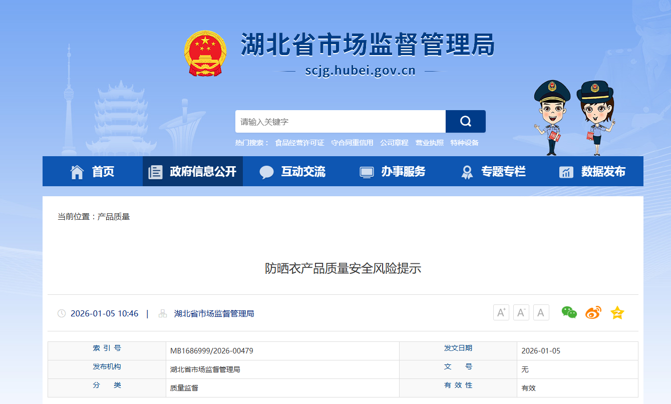 湖北省市场监管局发布防晒衣产品质量安全风险提示
