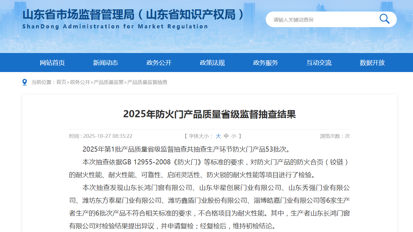 山东省市场监管局发布2025年防火门产品质量省级监督抽查结果