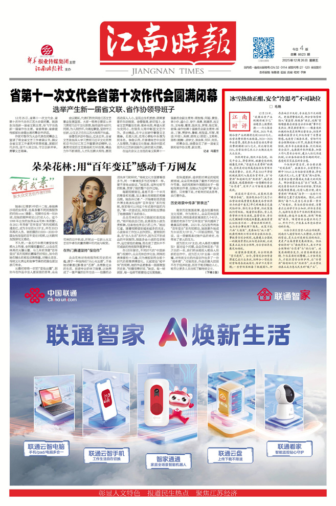 之南時多 90 4 M 总编 8623 期 2025年12月26日 星期五 00号:CN 32-0114 部落代号:27-120 990005 责任编辑 领整情 组队 高破 校时 手册 省第十一次文代会省第十次作代会圆满闭幕 11 11 4 10 12 30 2 2 6 4 1 选举产生新 届省文联、省作协领导班子 12月26日,省第一 记者 马题文 朵朵花林:用"百年变迁"感动千万网友 l, lot 历史场量中传承"新展达 成 时 评 & 品花桃对作视频体和厨房 在协门高温显持"倡创作" 膜通智家 △ 换新生活 联通云智电脑 联通看家 手机/pad/电脑多合 器期监控贴心电影 联通元 联通云德 l-40°C (0) 2010 影局人文结色 报道昆生执占 聚焦江苏经济 冰雪热劲正酣,安全"冷思考"不可缺位 IIANGNAN TIMES 冰雪热劲正酣,安全"冷思考"不可缺位 □ 系统 顶层设计需补位,政策规范要"精准导航"。国务院办公厅《关于以冰雪运动高质量发展激发冰雪经济活 力的若干意见》早已明确要求完善风险评估、强化安全管理,但政策落地仍有短板。随着雪地摩托、雪 上龙舟等新兴项目涌现,监管空白、责任认定模糊 ...