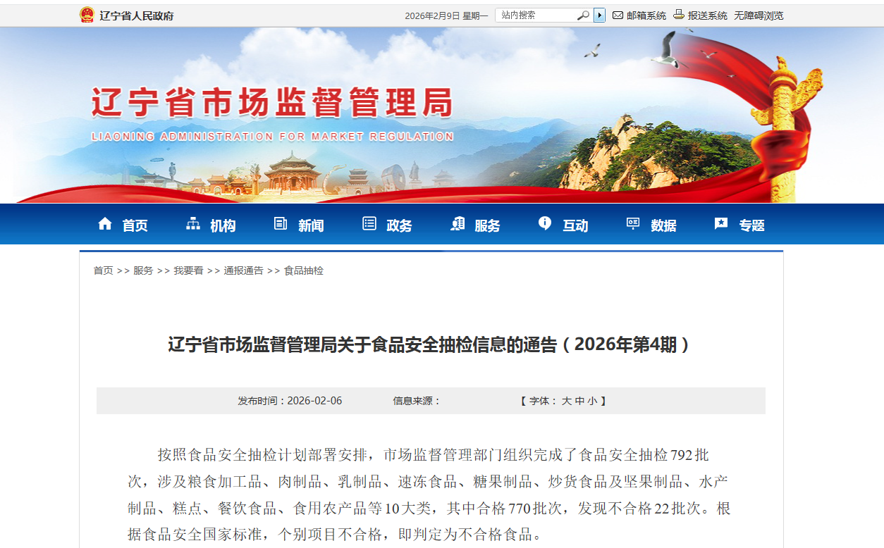 辽宁省市场监督管理局关于食品安全抽检信息的通告(2026年第4期)