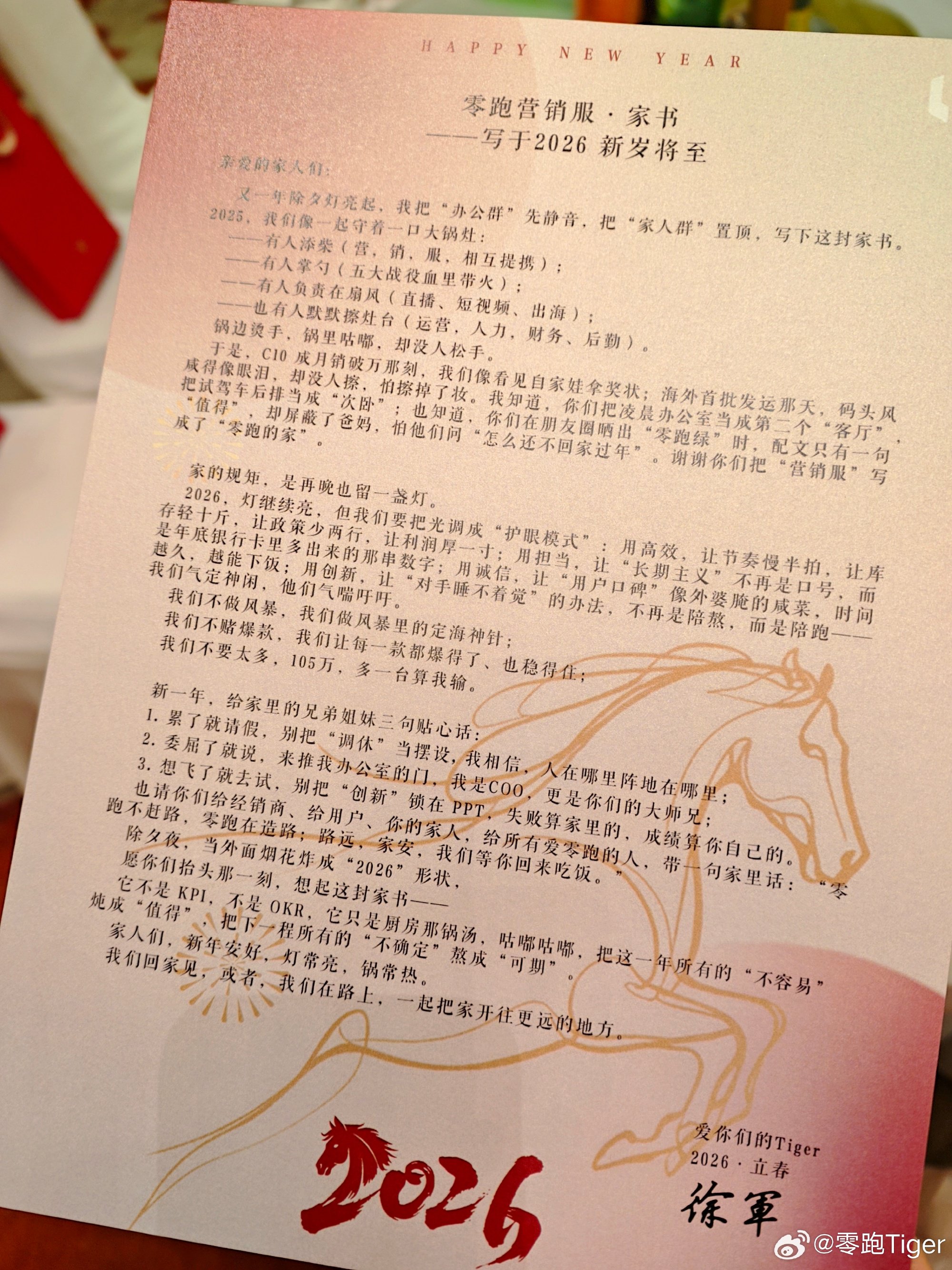 公司2026年战略方向与经营目标 - 公司计划在2026年调整经营节奏,追求更健康、可持续的增长模式,具体表现为“让节奏慢半拍、让库存轻10斤、让政策少两行、让利润厚一寸” [1][3] - 公司设定了2026年明确的销量目标为105万台,并强调“多一台算我输”,显示出对目标精准达成的决心 [1][4][6] - 公司强调不追求成为市场的“风暴”,而是要做“风暴里的定海神针”,表明其追求稳健和市场稳定器的定位 [1][4][6] 公司2025年运营回顾与团队文化 - 公司在2025年通过团队协作(如营销、销售、服务、直播、短视频、运营、人力等部门共同努力)取得了关键产品C10月销量突破1万台的成绩 [6] - 公司内部形成了强烈的“家”文化,员工表现出高度的奉献精神,例如将试驾车后排当作“次卧”,并因害怕家人担心而屏蔽工作信息 [6] - 公司管理层强调对员工的关怀,鼓励员工“累了就请假”、“委屈了就说”、勇于尝试创新,并承诺办公室大门随时敞开 [7] 公司核心经营理念与竞争策略 - 公司强调不依赖单一“爆款”产品,而是追求让每一款产品都能成功并保持稳定市场表现 [1][4][6] - 公司计划通过“高效”、“诚信”和“创新”来构建核心竞争力,目标是让“对手睡不着觉”,而自身保持“气定神闲” [6] - 公司的最终目标是实现盈利,将“利润厚一寸”具体化为员工“年底银行卡里多出来的那串数字” [1][3][6]