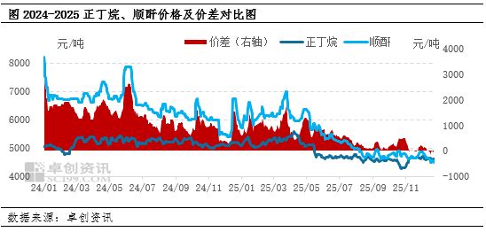 首先,供应刚性与需求弹性的错配是核心矛盾。正丁烷作为炼油环节中的副产品,其供应受烷基化和气 分装置开工负荷不足的影响,表现出较强的刚性。12月上半月,部分企业因自用或检修阶段性停出,加 剧了商品资源的紧张。而顺酐的需求端则高度敏感于宏观经济和终端消费,在季节性淡季和整体经济承 压的背景下,树脂等下游行业需求萎缩,表现出极大的弹性。当刚性的成本遇上弹性且疲软的需求,价 格传导机制必然断裂。 12月正丁烷市场价格震荡走高的同时,其关键下游产品——顺酐的市场价格却持续探底,两者间形成了 显著且持续的价格倒挂。这种原材料成本与终端售价的背离,并非短期波动所能解释,而是深刻揭示了 以正丁烷-顺酐为代表的特定化工产业链条所面临的结构性困局。 成本高企与需求疲软 从数据来看,正丁烷市场在整个12月上半月呈现出"震荡整理,高位坚挺"的韧性。尽管阶段性因出货转 淡偶有回落,但在下游逢低补货、局部备料以及供应端资源偏紧的支撑下,价格迅速回归。下游买涨入 市的心态推动盘面出现溢价现象。与之形成对比的是,顺酐市场则深陷"跌跌不休"的泥潭。由于终端树 脂等行业开工率持续走低,需求极度疲软,顺酐工厂即使普遍挺价并加大减产力度,成交依然清 ...