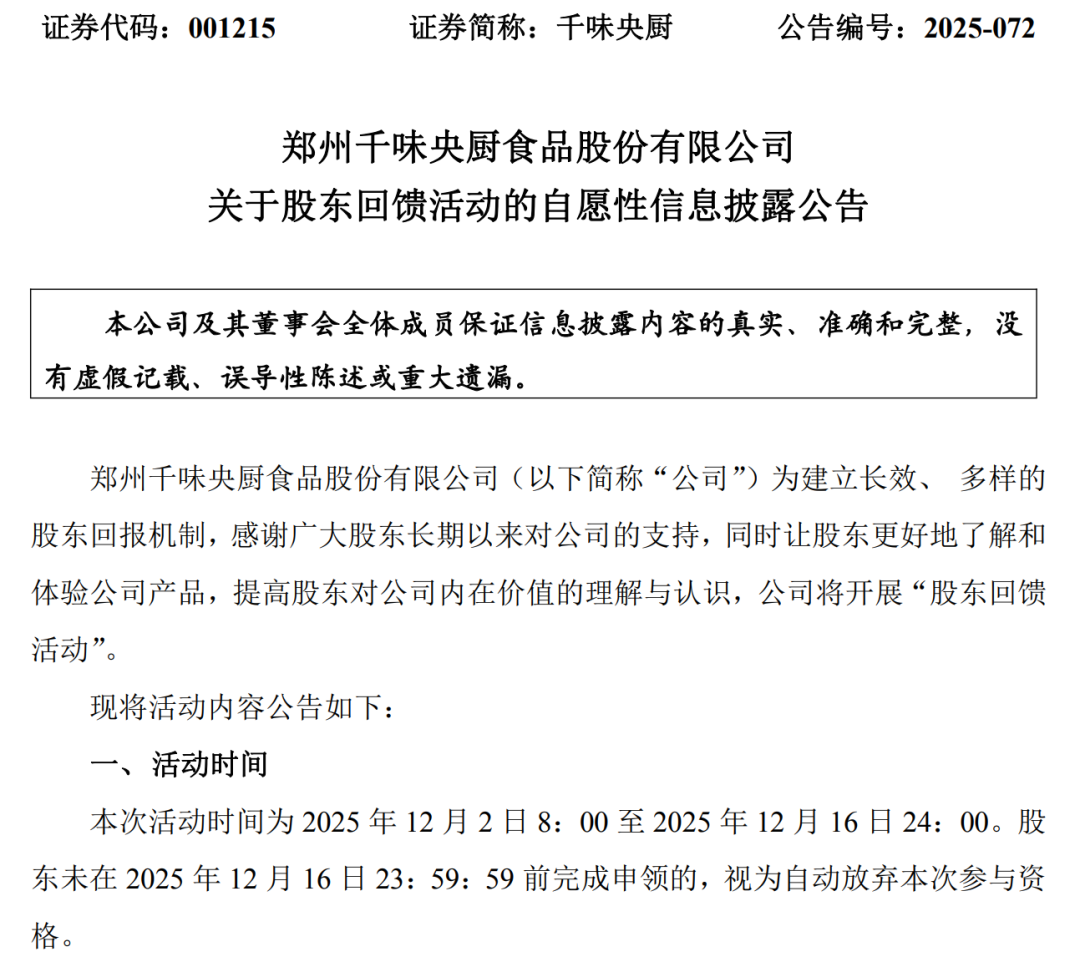 【导读】 千味央厨: 持有100股(含)以上的自然人股东可领取1份价值200元的产品礼包 中国基金报记者 泰勒 峨眉山之后,又有上市公司回馈股东了! 12月1日收盘后,上市公司 千味央厨 发布公告, 为建立长效、多样的股东回报机制,感谢广大股东长期以来对公司的支持,同时让股东更 好地了解和体验公司产品,提高股东对公司内在价值的理解与认识, 公司将开展"股东回馈活动"。 公告称,于2025年12月1日下午收市时在中国证券登记结算有限责任公司深圳分公司登记在册的持有公司股份100股(含)以上的股东, 可以参与本次股东回馈活动。自然人股东须本人申请可领取1份公司产品礼包;法人股东须指定一人申请可领取3份公司产品礼包(若同一 持股主体有多人报名,以先收到的申领信息为准)。 公告显示,股东可以凭有效信息验证股东身份参与活动。公司将根据验证成功的股东,赠予价值200元公司产品礼包作为回馈。 与峨眉山A不同,千味央厨的回馈股东活动, 仅限于12月1日收盘前的持股股东,而 峨眉山是 2025年12月1日至2026年1月31日, 持 500股以上股东可免景区、索道门票。 公开资料显示,2021年9月,千味央厨正式登陆深交所,被 ...