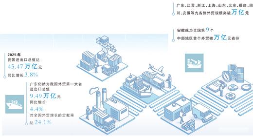 2025年中国外贸总体表现 - 2025年,中国货物贸易进出口总值达45.47万亿元,同比增长3.8%,继续保持全球货物贸易第一大国地位 [1] - 广东、江苏、浙江、上海、山东、北京、福建7省市合计进出口34.11万亿元,贡献了全国一半以上的外贸增量 [3] - 出口正从“数量扩张”逐步向“数量扩张和质量提升并重”转变,高技术产品成为贸易增长的引领力量 [3] 产业升级与竞争力 - 外贸高质量发展的核心底气源于产业竞争力的迭代升级 [2] - 2025年,广东高技术产品出口首次突破1万亿元,达到1.14万亿元 [2] - 江苏外贸呈现“集群化升级”特征,2025年该省机电产品出口比重首超七成 [2] - 比亚迪以自有船队、直营模式向阿根廷出口5800多辆新能源汽车,是中国车企首次系统性进入阿根廷市场 [2] - 远景能源从江苏江阴综合保税区向海外发运风电叶片 [2] 市场多元化布局 - 全球贸易环境复杂多变,倒逼各地加速国际市场多元化布局,以分散单一市场波动风险 [4] - 2025年,广东对东盟、欧盟、中国香港三大贸易伙伴进出口均突破万亿元;对共建“一带一路”国家进出口达3.66万亿元,增长5% [6] - 2025年,东盟首次超越欧盟成为浙江第一大贸易伙伴,进出口8690.7亿元,增长16.5% [6] - 上海作为国际航运中心,2025年对共建“一带一路”国家进出口增长12.1% [6] - TCL通过中欧班列将半导体显示面板等关键零部件运往波兰工厂,致力于从输出产品转变为输出工业能力 [4][6] - 义乌小商品通过“义新欧”班列直达中亚、欧洲20多个国家,形成“买全球、卖全球”的贸易网络 [6] 新业态与数字化转型 - 在数字技术赋能、物流体系升级、政策环境优化的助力下,外贸企业打破了传统贸易的时空限制 [8] - 2025年,浙江市场采购、跨境电商、保税维修等新业态合计出口超9000亿元,居全国首位 [8] - 2025年,浙江义乌中国小商品城市场预计抽样成交额超3200亿元,日均外商超4000人,创10年新高 [3] - 苏州打造的跨境电商综合服务平台整合全流程服务,2025年带动中小企业跨境电商出口增长35% [8] - 2025年,上海服务贸易收支总额超2500亿美元,同比增长2.2%,占全国比重接近30% [8] - 上海新兴生产性服务贸易,即依托数字技术、知识密集型要素为生产和商业提供中间服务的贸易,呈现良好发展态势 [8]