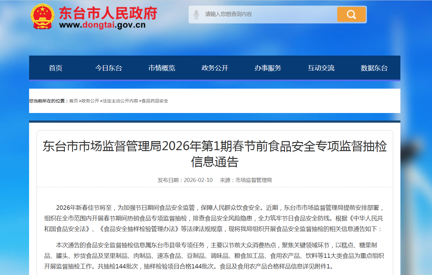 江苏省东台市市场监督管理局2026年第1期春节前食品安全专项监督抽检信息通告