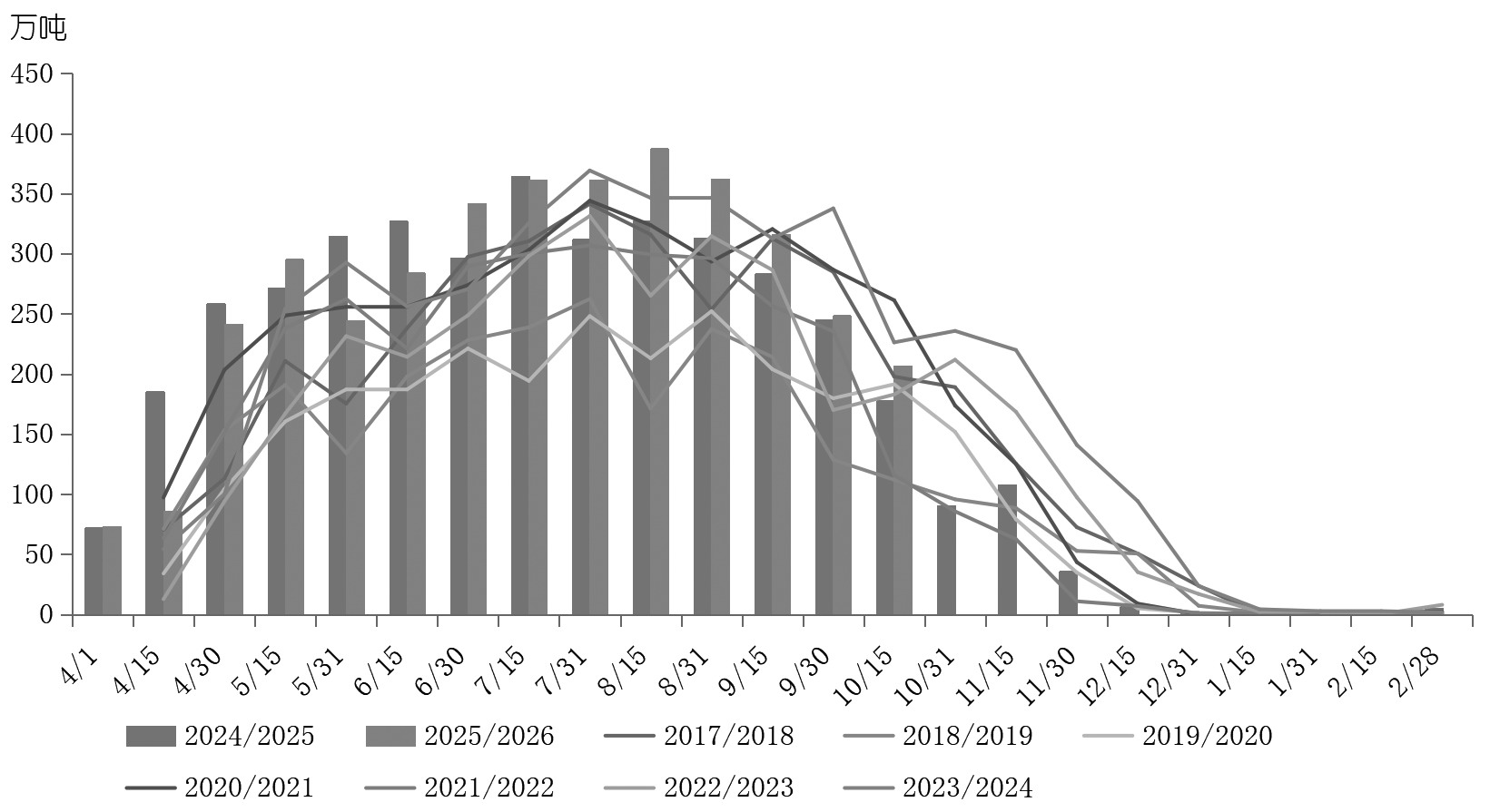 10月下半月,巴西中南部地区甘蔗入榨量为3110.8万吨,同比增长14.34%;制糖比为46.02%,较去年同期的45.91%上升0.11个百分点;产糖量为206.8万吨, 同比增长16.4%。截至10月下半月,巴西中南部地区累计甘蔗入榨量为55602.9万吨,同比下降1.97%;制糖比为51.97%,较去年同期的48.59%上升3.38个百 分点;产糖量为3808.5万吨,同比增长1.63%。实际产量数据和市场预期基本一致,丰产仍在榨季末期延续。 需要注意的是,制糖比相比前期有所下滑,市场担忧制糖比快速下滑对整体产量的影响。目前市场普遍预期2025/2026榨季巴西中南部地区糖产量将在4050 万~4150万吨之间,维持丰产格局。展望2026/2027榨季,更多甘蔗或转向乙醇生产,预计巴西中南部地区糖产量回落至4000万吨附近。此外,圣保罗地区 持续干旱,可能影响2026/2027榨季甘蔗生物量积累,需持续跟踪。 [巴西丰产带来高出口] 受干旱天气和宿根蔗经历火灾的影响,巴西2025/2026榨季前期显示甘蔗质量不佳,但是被不断创纪录的超高制糖比所弥补。巴西国家商品供应公司 (Conab)发布的巴西2025 ...
