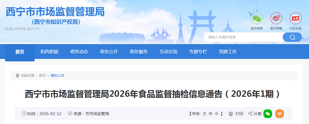 西宁市市场监督管理局2026年食品监督抽检信息通告(2026年1期)