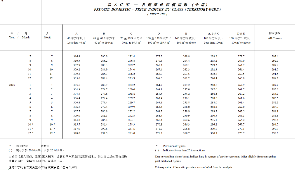 香港住宅楼价在经历三年下跌后迎来转折点。利率下调和库存减少推动市场情绪改善,2025年全年楼价录得自2021年以来的首次年度上涨。 香港政府差饷物业估价署周三公布的数据显示,2025年全年私人住宅楼价上涨3.3%。12月楼价环比上涨0.2%,连续第七个月录得增长,此前11月 经上调后的涨幅为1.1%。 | ..4 | | | | | | 私人住宅 - 各 類 單 位 售 價 指數 (全 港) PRIVATE DOMESTIC - PRICE INDICES BY CLASS (TERRITORY-WIDE (1999 = 100) | | | | | | --- | --- | --- | --- | --- | --- | --- | --- | --- | --- | --- | | 年 / Year / Month | 月 | 月 Month | ਮ 40 平方米以下 Less than 40 m* | в 40 至 69.9 平方米 40 m2 to 69.9 m2 | C 70 至 99.9 平方米 70 m* to 99.9 m* | D 100 至 159.9 平方米 100 m2 to 159 ...
