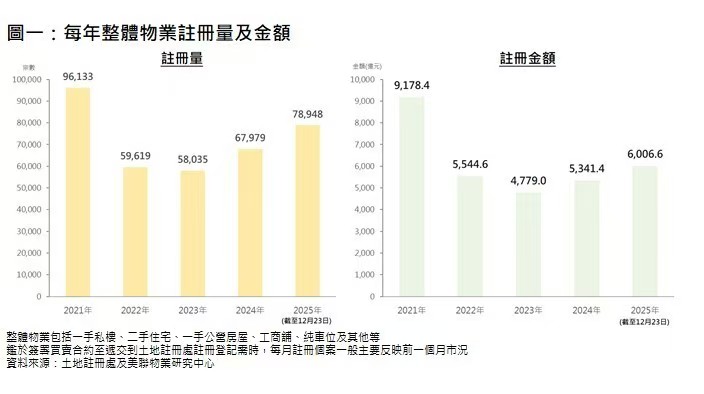 香港楼市整体表现 - 截至12月23日,香港整体物业注册量录得78,948宗,较去年全年67,979宗高出约16.1% [1] - 同期整体物业注册金额录得6,006.6亿港元,较去年全年5,341.4亿港元高出约12.5% [1] - 整体物业注册宗数与金额均创下4年新高 [1] - 预期今年整体物业注册量最终将突破80,000宗水平 [4] 市场驱动因素分析 - 住宅市场受租金攀升、息口回落影响,“供平过租”吸引用家由租转买,加快入市决定 [4] - 租金回报率维持在相对吸引水平,促使长线投资者积极入市 [4] - 香港政府年初下调低价物业印花税措施,为住宅交投带来利好刺激 [4] - 下半年市场表现更突出,与股市向好及美国重启减息有关 [5] 下半年市场加速 - 下半年(截至12月23日)整体物业注册量录42,100宗,较上半年上升约14.3% [5] - 下半年整体物业注册金额录约3,236.3亿港元,较上半年上升约16.8% [5] - 下半年注册量额齐创4年新高 [5] 住宅市场具体表现 - 截至12月23日,一手私楼及二手住宅注册量合共录65,677宗,较去年全年57,602宗同比增加约14% [7] - 同期住宅注册金额录5,231.9亿港元,较去年全年4,670.9亿港元上升约12% [7] - 住宅注册量额与整体物业同创4年新高 [7]